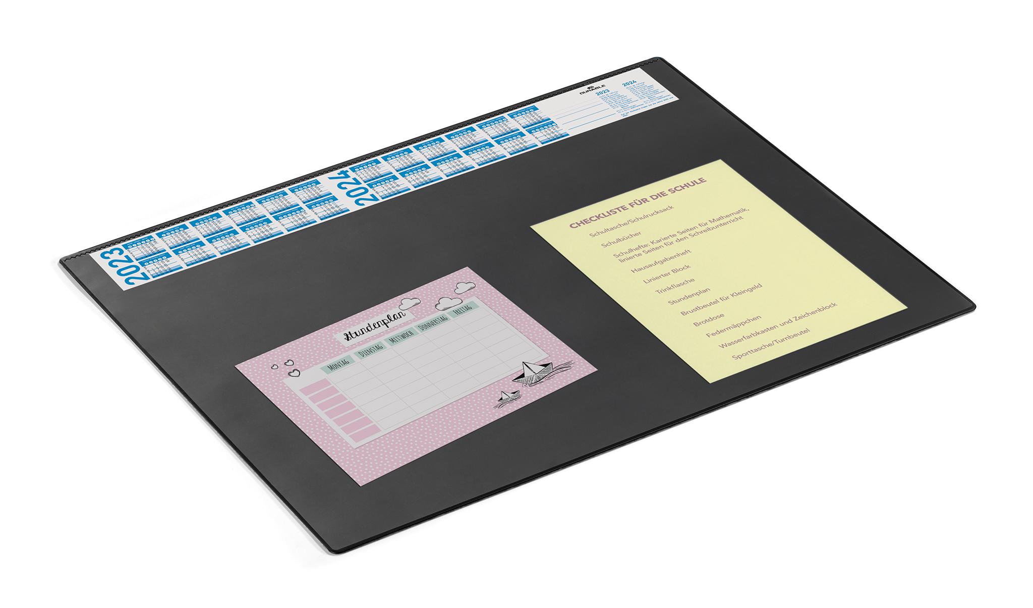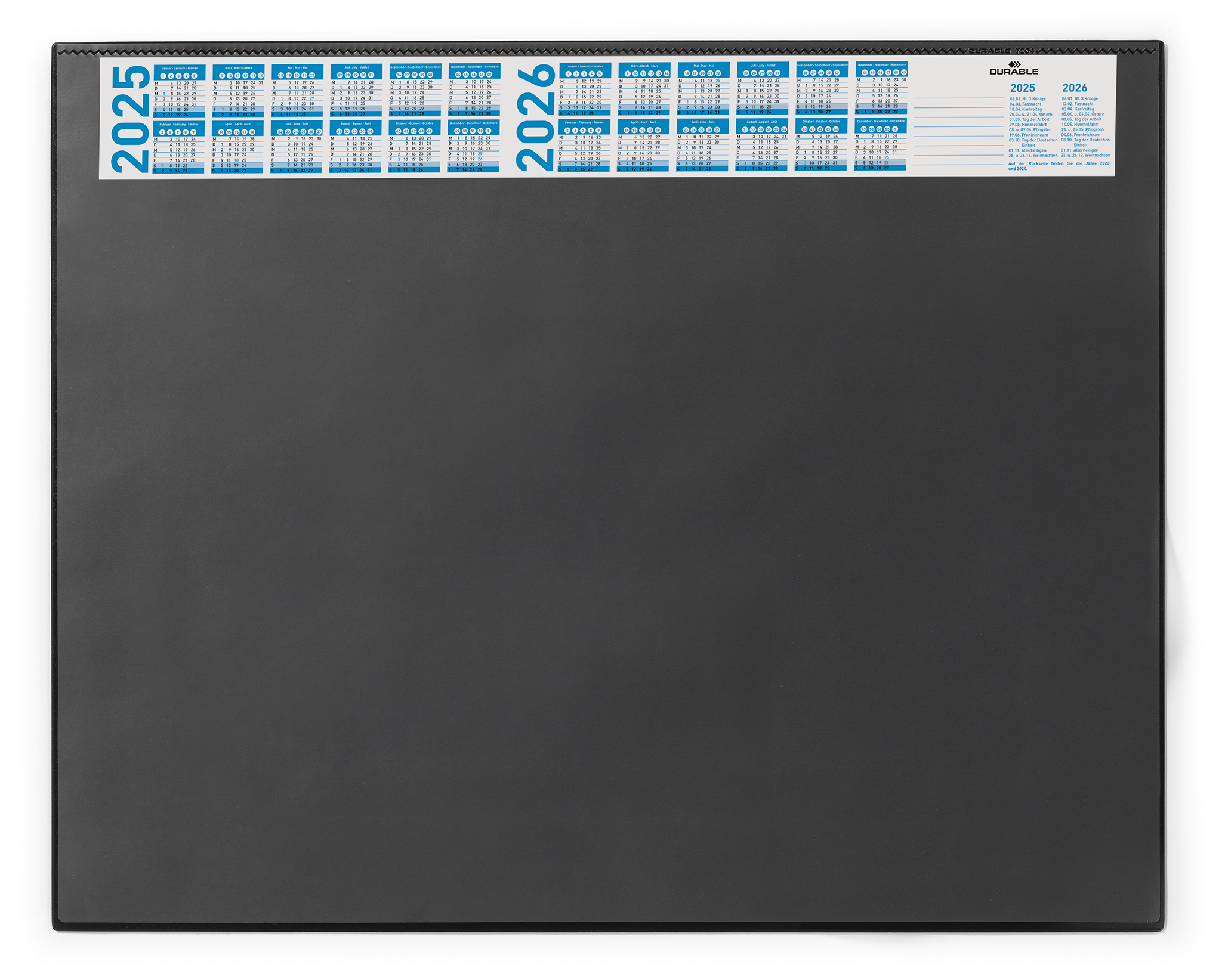 DURABLE skriveunderlag er tilgængelige i forskellige formater, så de passer til individuelle krav. Alle skriveunderlagene er behagelige at bruge og kommer i en række stilfulde designs, der passer til enhver arbejdsplads. •Skriveunderlag med transparent dækplade •Med en smal årskalender i 4 år •Skridsikker •Mål: 650 x 520 mm (B x H)