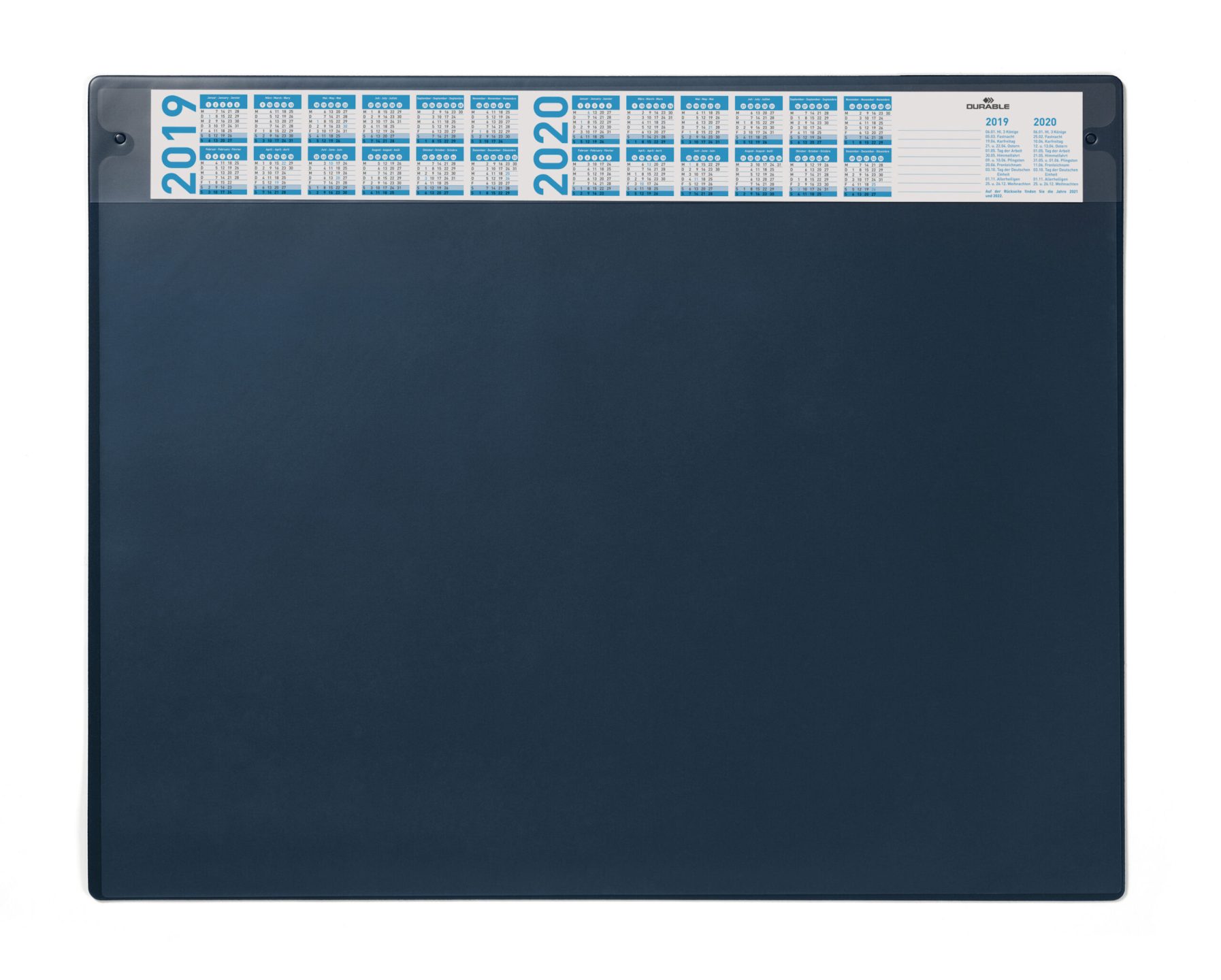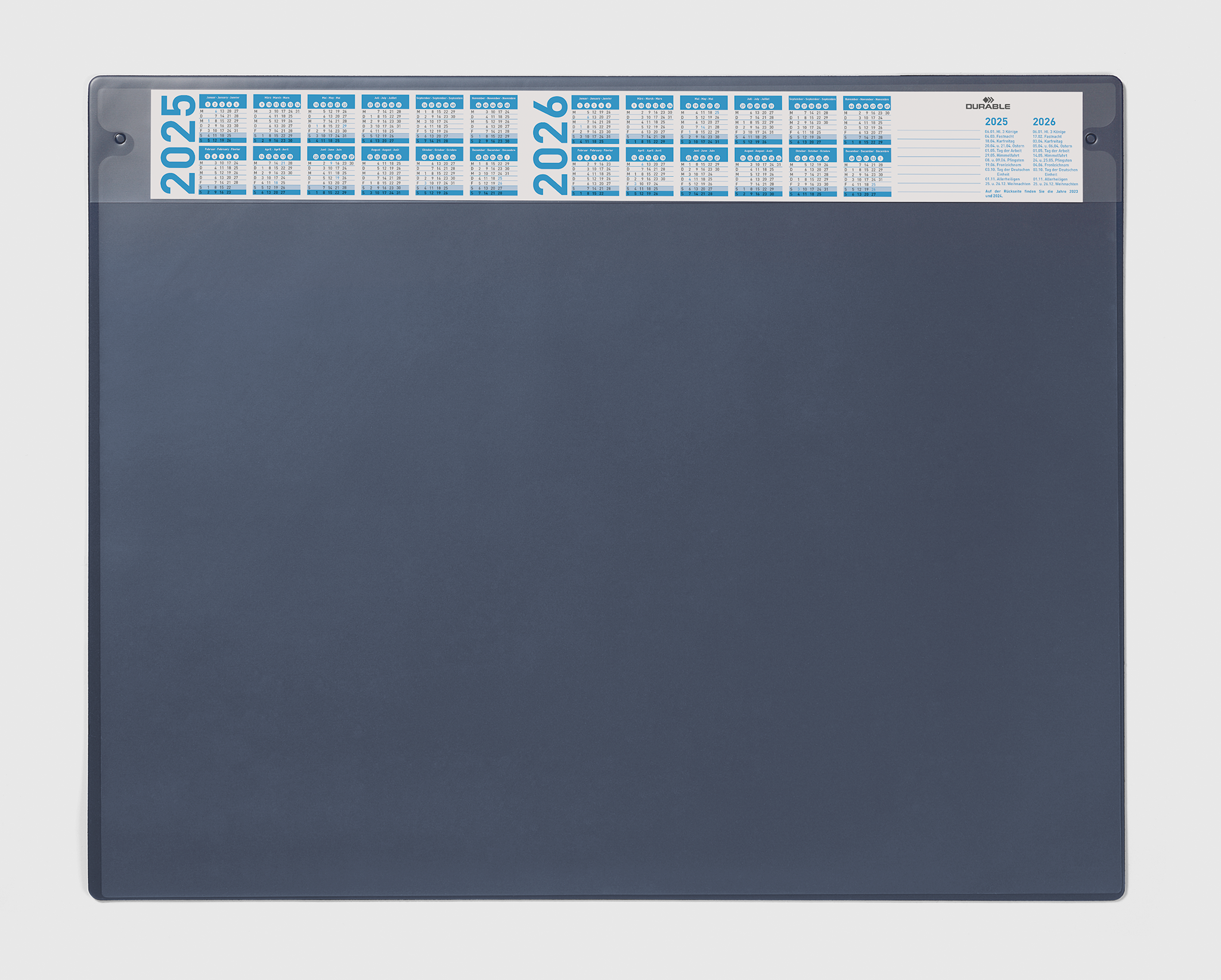 DURABLE skriveunderlag er tilgængelige i forskellige formater, så de passer til individuelle krav. Alle skriveunderlagene er behagelige at bruge og kommer i en række stilfulde designs, der passer til enhver arbejdsplads. •Skriveunderlag med anti-genskin og udskiftelig dækplade •Med en smal årskalender i 4 år •Til underliggende notater og dokumenter mm.. •Skridsikker •Mål: 650 x 520 mm (B x H)