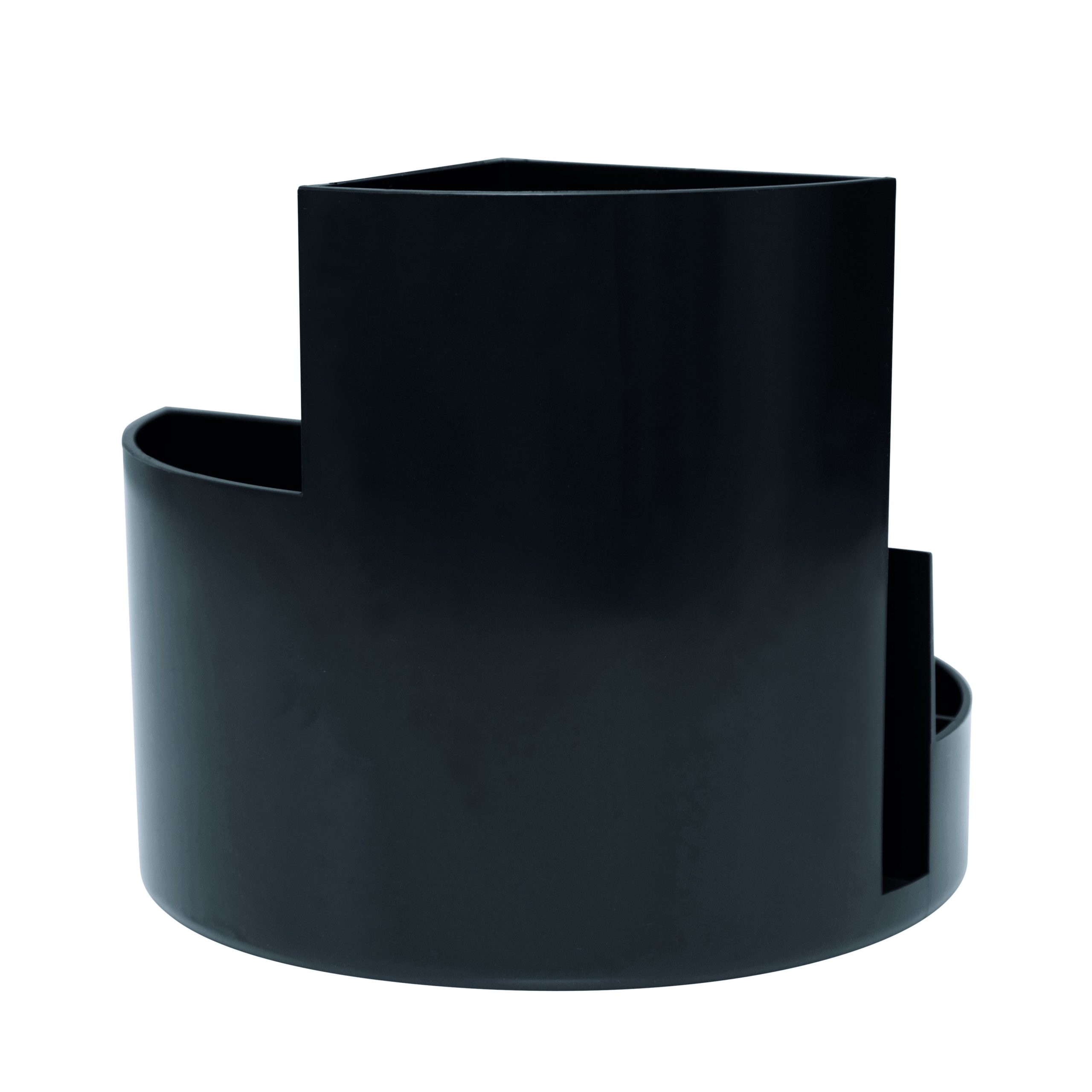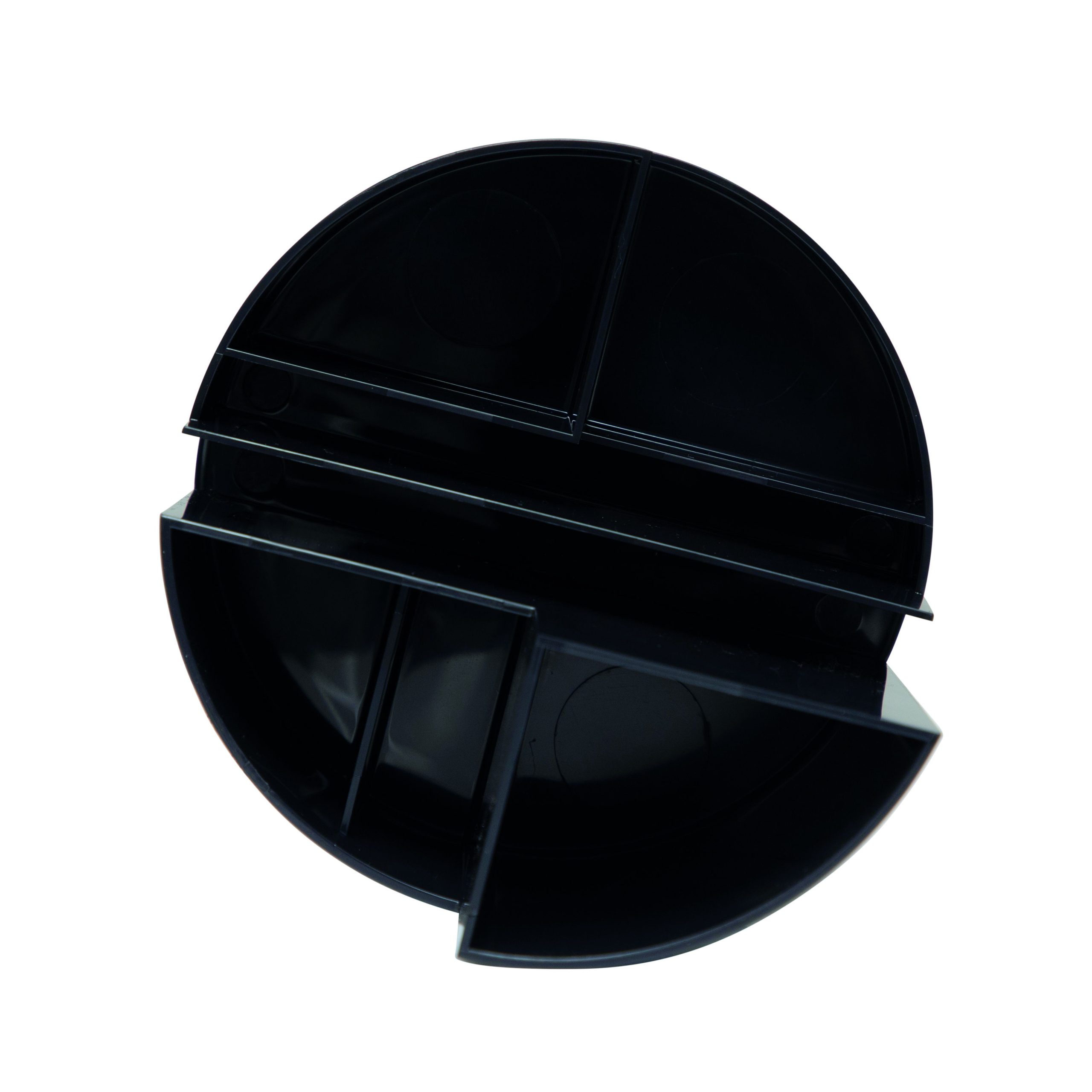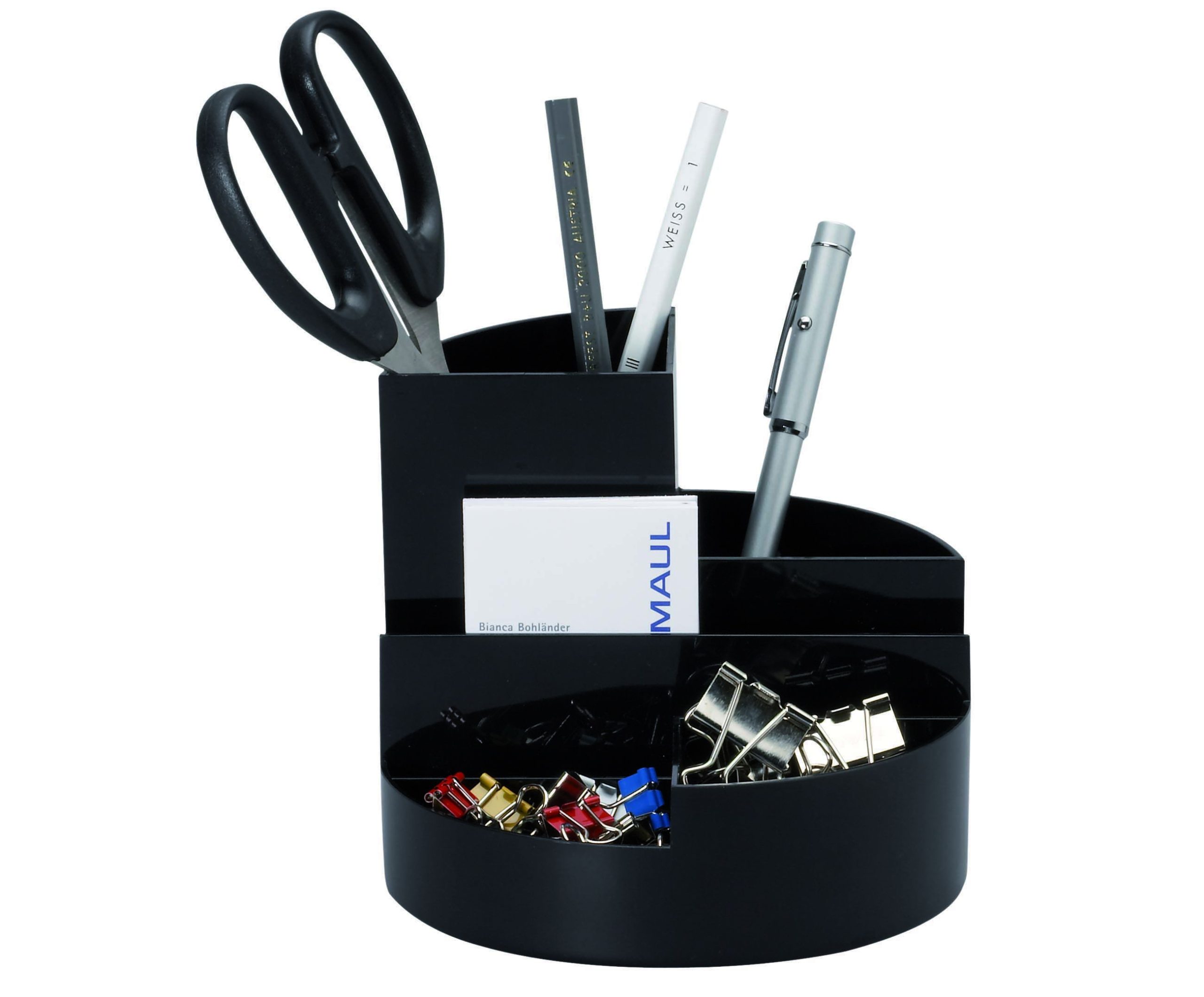 Skrivebordsorganizer MAULroundbox, sort Med denne skrivebordsorganizer fra MAUL bliver det nemmere at holde orden på dine kontorartikler og andre småting. Skrivebordsorganizeren er udstyret med seks separate rum i forskellige størrelser til opbevaring af blandt andet kuglepenne, sakse, linealer, lim, clips m.m. Den er fremstillet i sort PS-plast, der giver et stilrent og professionelt udtryk på skrivebordet. Produktet er fremstillet i Tyskland. Skrivebordsorganizeren er velegnet til både kontoret og hjemmekontoret, men den fungerer også perfekt i køkkenet eller på badeværelset til kosmetik. Mål: Ø 14 cm x H 12,6 cm