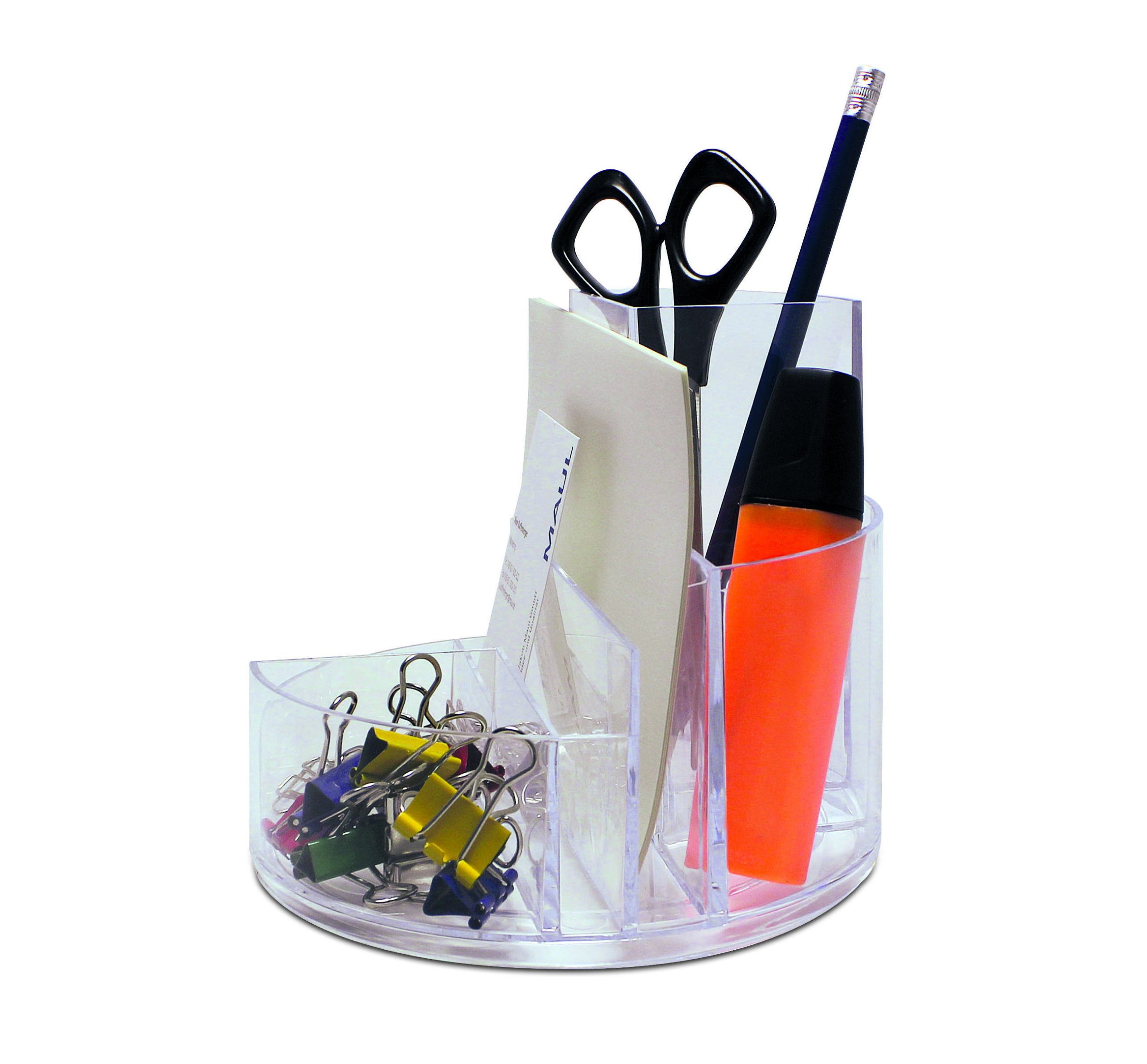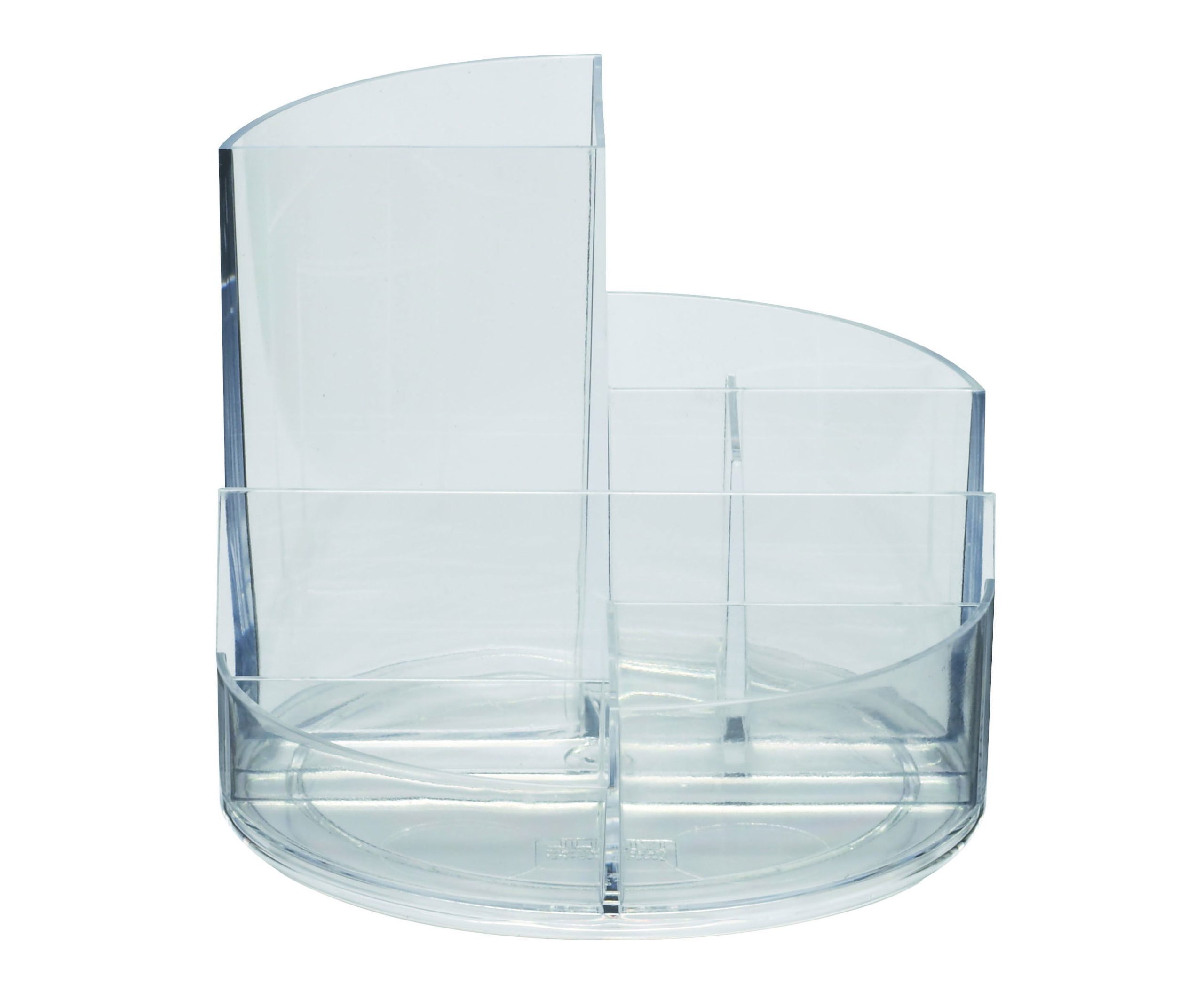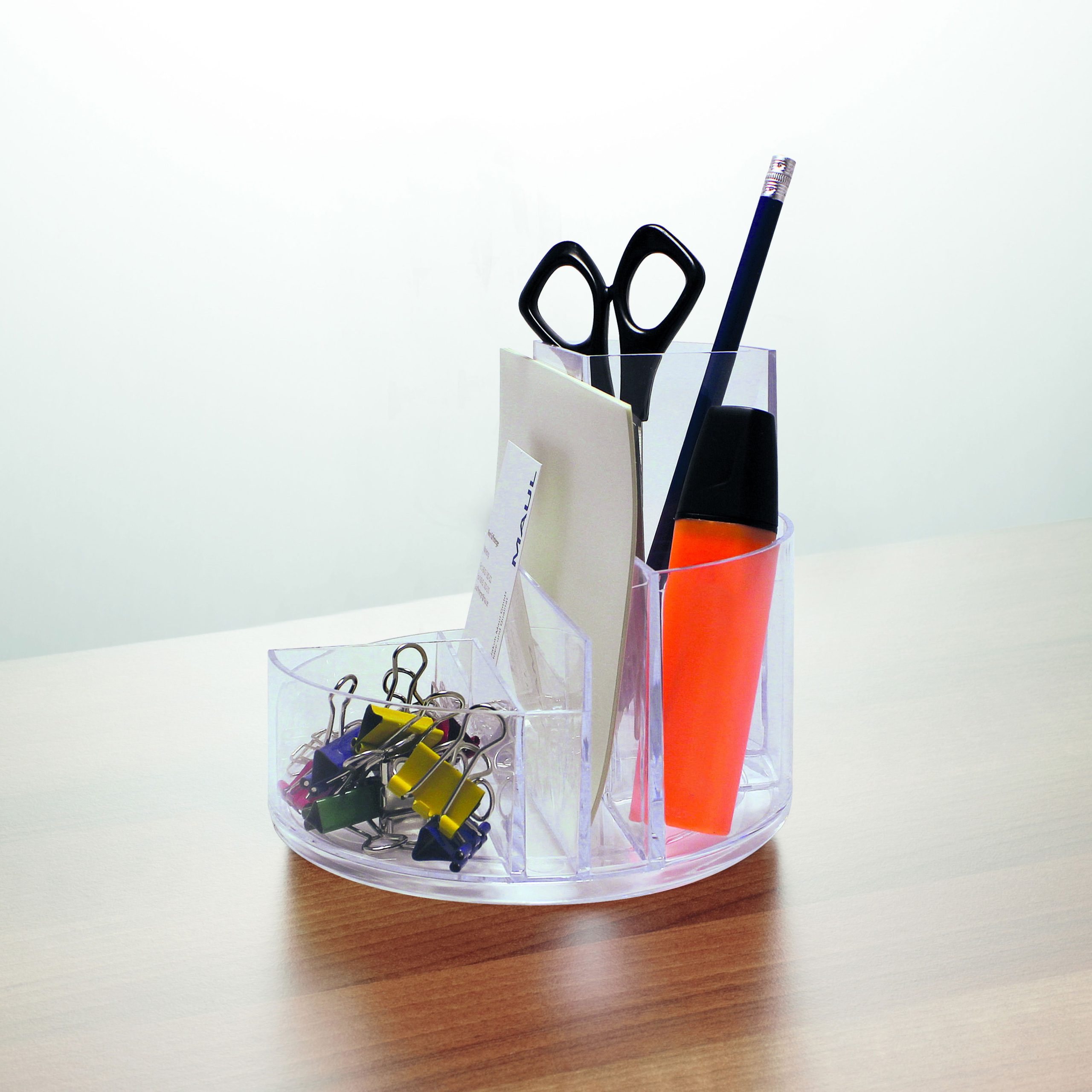 Skrivebordsorganizer MAULroundbox, transparent Med denne skrivebordsorganizer fra MAUL bliver det nemmere at holde orden på dine kontorartikler og andre småting. Skrivebordsorganizeren er udstyret med seks separate rum i forskellige størrelser til opbevaring af blandt andet kuglepenne, sakse, linealer, lim, clips m.m. Den er fremstillet i transparent plast, der giver et stilrent og professionelt udtryk på skrivebordet. Produktet er fremstillet i Tyskland. Skrivebordsorganizeren er velegnet til kontoret, men den fungerer også perfekt i køkkenet, kreahjørnet eller på badeværelset til kosmetik. Mål: Ø 14 cm x H 12,6 cm