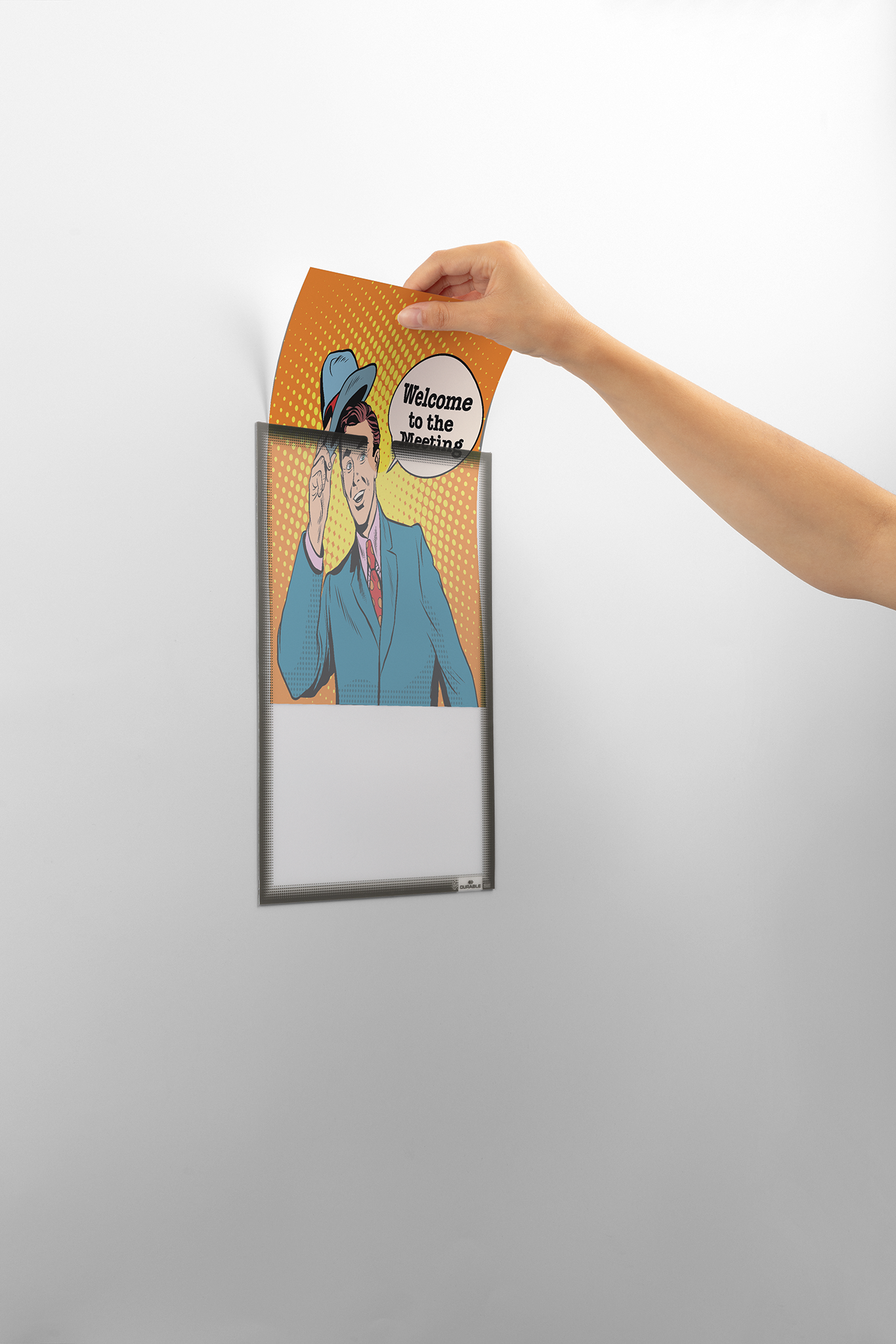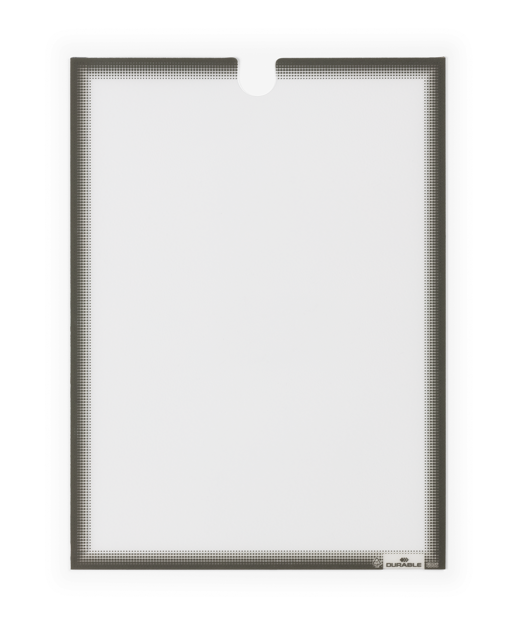 Selvklæbende dokumentholder i polypropylen til at vise og beskytte midlertidig information på udstillinger og events, i butikker og på kontorer. Placer beskyttelsesarket – med tre selvklæbende strimler på bagsiden – over dokumentet, og sæt det op på en glatte overflader indendørs. Færdig! Pænere og nemmere at anvende end f.eks. tape. Tommelfingergreb til nemt at skifte dokumentet, når lommen er sat op. Kan fjernes fra underlaget uden at efterlade mærker. Tapen kan skilles fra plastfolien, så materialet kan sorteres til genbrug, når dokumentholderen bortskaffes efter endt brug. Til dokumenter i A4-størrelse, indvendige mål 301×214 mm, udvendige mål 323×236 mm. Farve: grå prikket kant Pose med 5 stk.