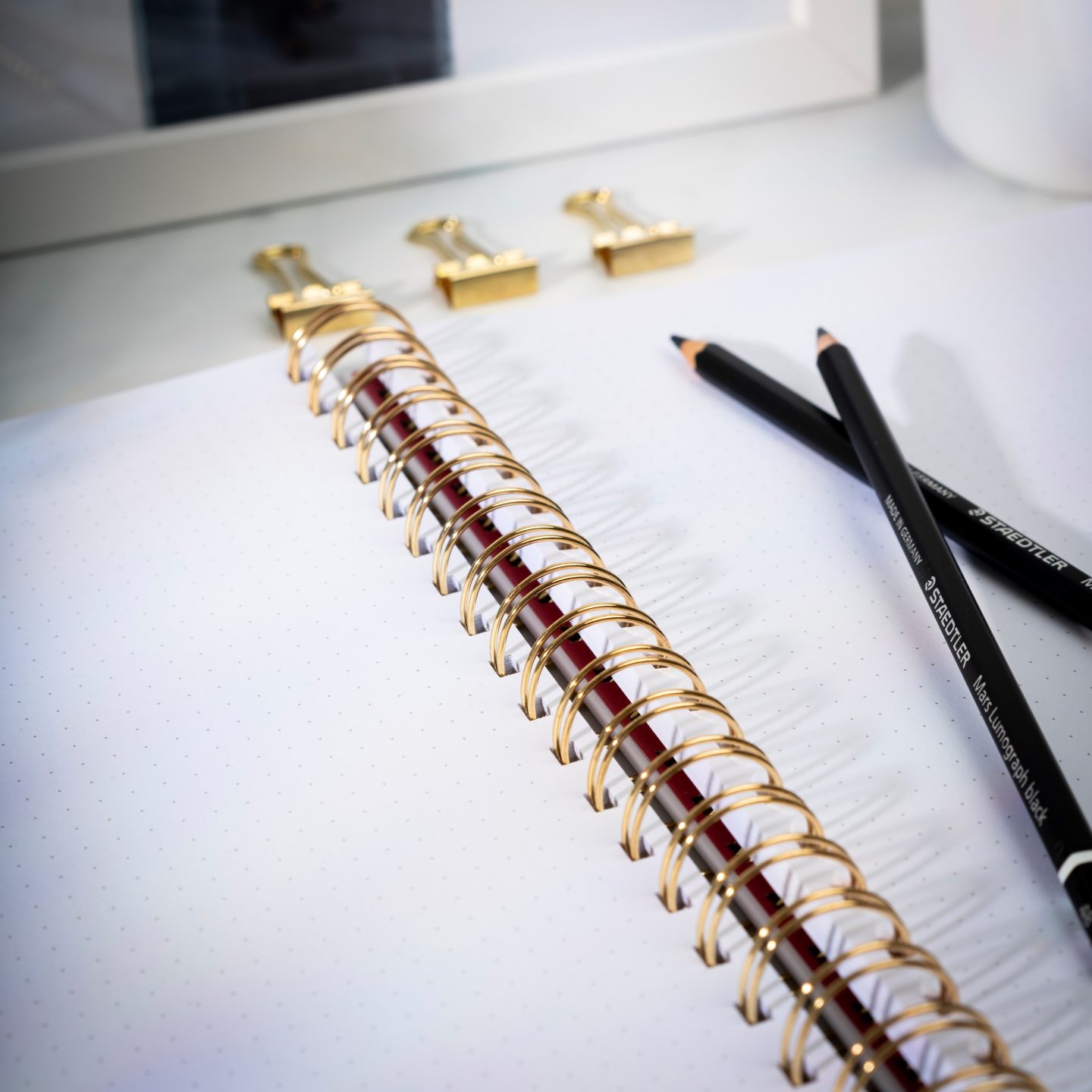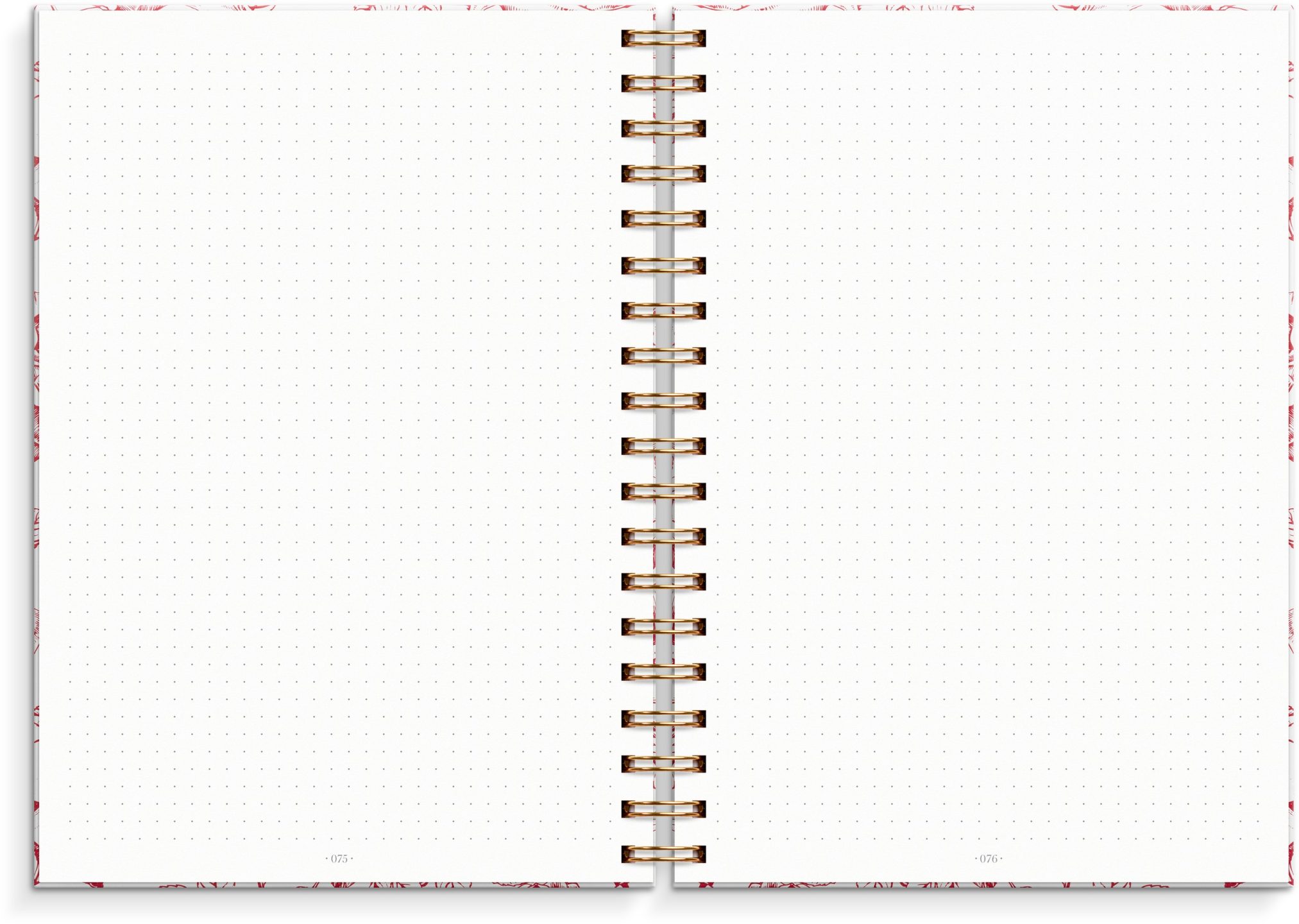 DotNotes er en bullet journal – en blandning mellem en notesbog og personlig kalender. Giver mulighed for individuelt design . Indeholder tre stregsider, samt 135 prikkede og nummerede sider til personlige kreationer: kalender, to-do-liste, noteringer eller andet. Kartonomslag med røde blomster og guldpræg. Spiralindbundet med spiral i guld. 120 g hvidt syrefrit papir, 70 blade (140 sider). FSC®. Format: 176×250 mm.