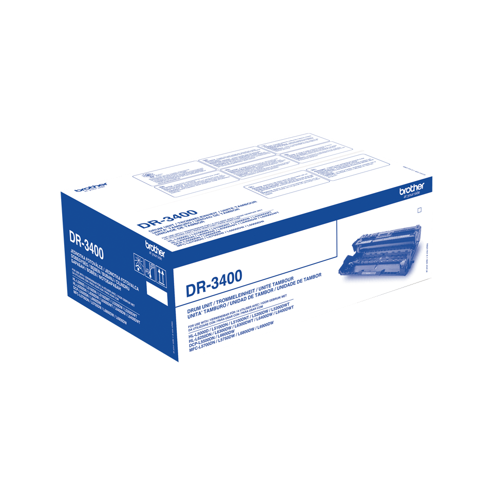 Brother DR-3400. Type: Original, Mærke kompatibilitet: Brother, Kapabilitet: HL-L5000D, HL-L5100DN, HL-L5100DNT, HL-L5200DW, HL-L5200DWT, HL-L6250DN, HL-L6300DW, HL-L6300DWT,…. Bredde: 361 mm, Dybde: 131 mm, Højde: 228 mm. Pakkevægt: 670 g. Mængde pr. kasse: 1 stk. Pallens bruttohøjde: 14,6 cm, Pallens bruttovægt: 309,6 kg, Hovedkasser pr. palle (udvendigt): 27 stk