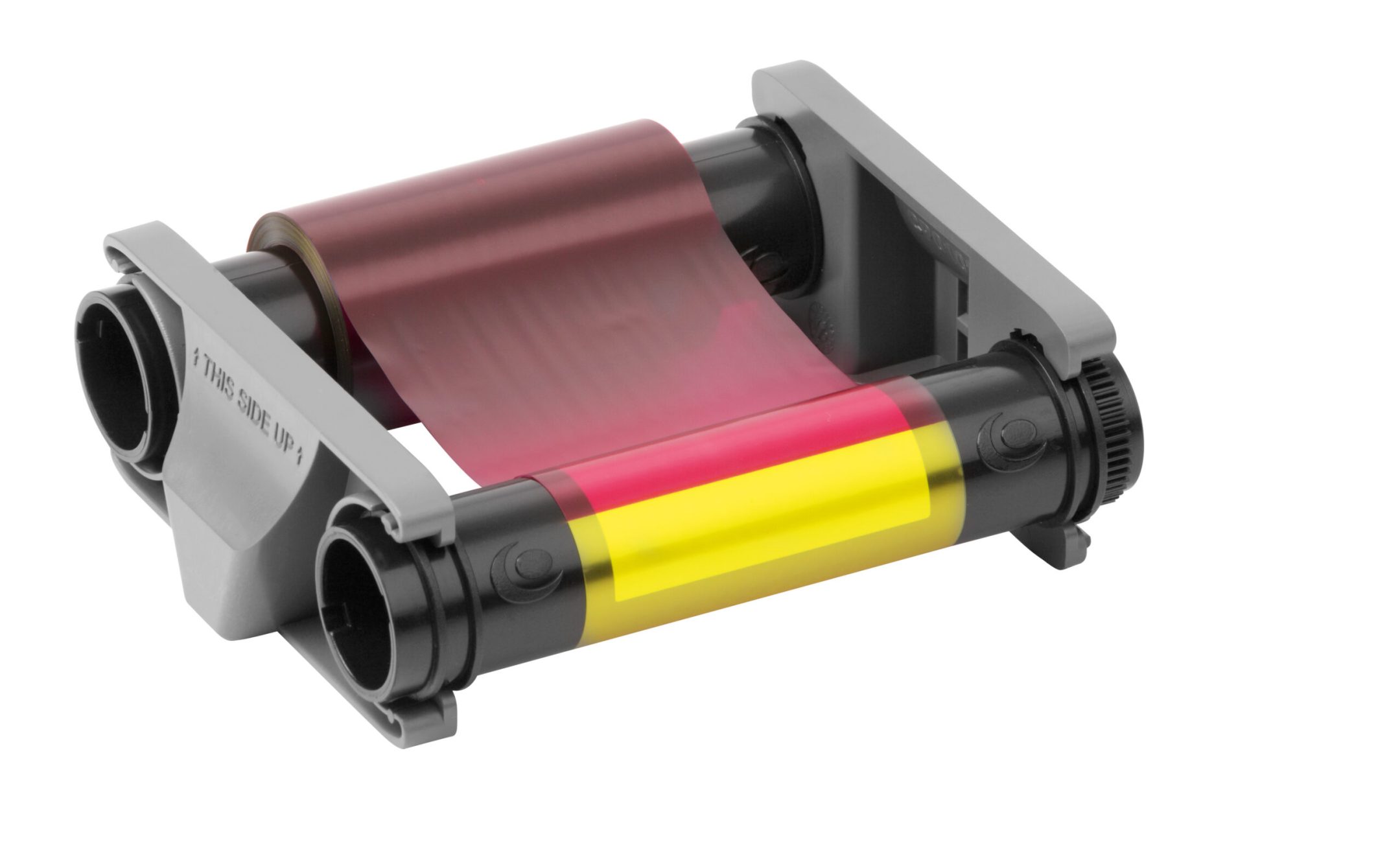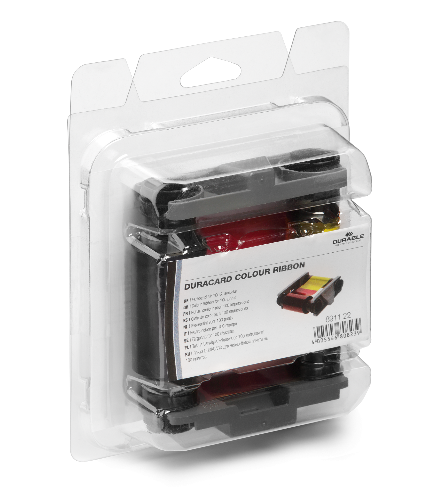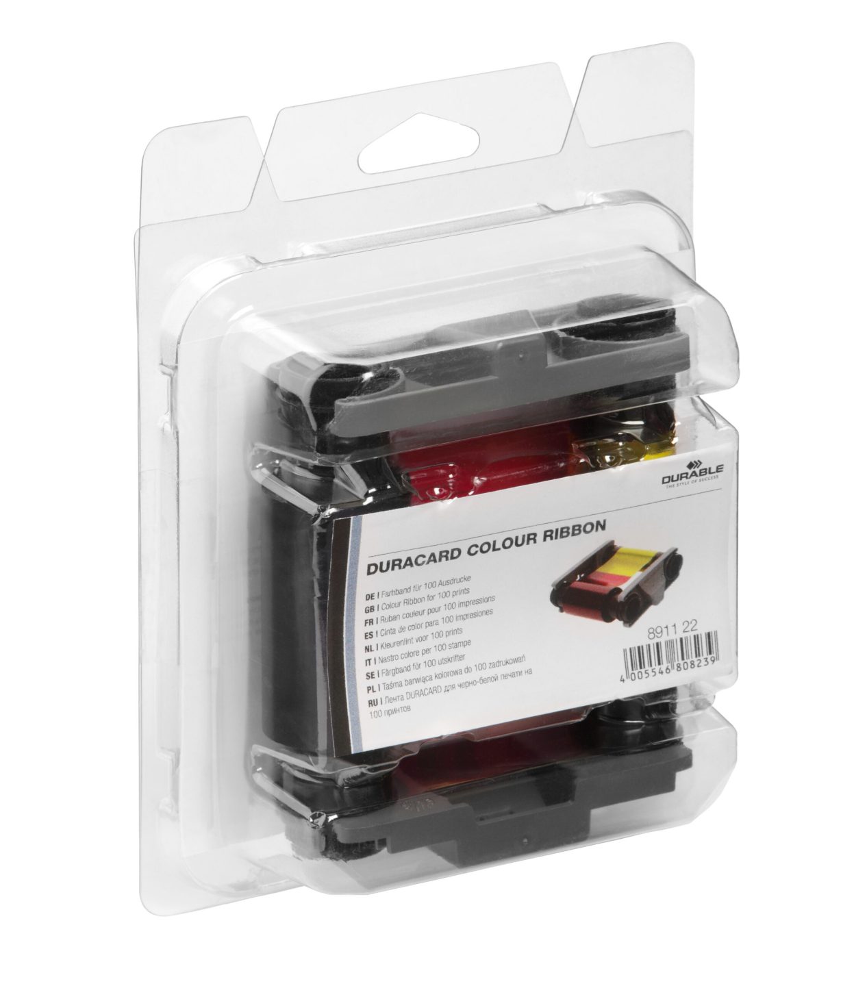 YMCKO farvebånd til plastkortprinter DURACARD til farveudskrivning i fotokvalitet, nok til 100 udskrifter. Med transparent lak finish beskytte kortet. Funktioner RFID-kodning for hurtig anerkendelse af bånd af DURACARD ID 300 printer. Nem udskiftning af bånd takket være kompakt format.