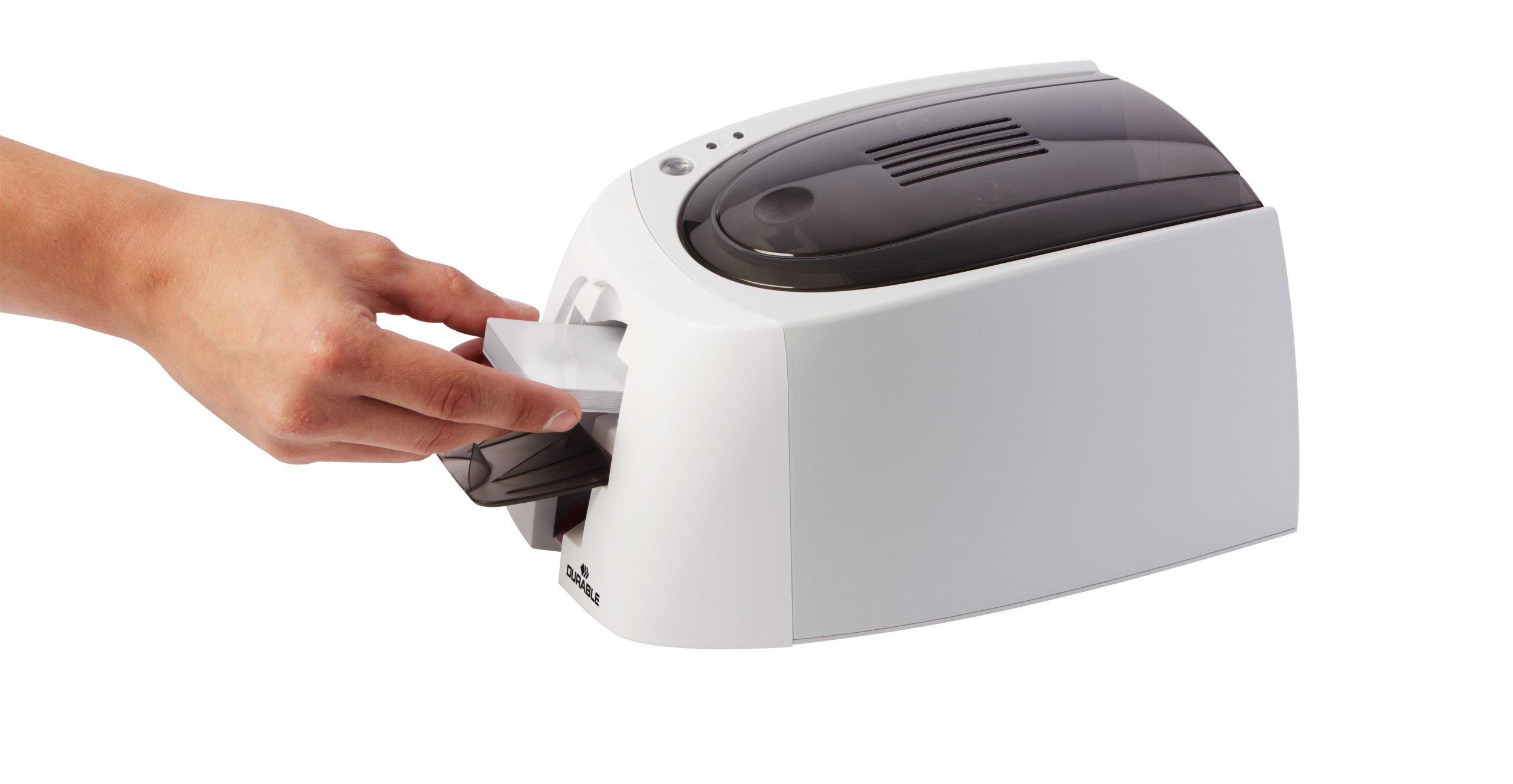 Plastkortprinter inkl. YMCKO farvebånd til farveudskrivning i fotokvalitet og 100 plastkort i kredit format. Printet falmer ikke og kan tåle vand. Kan printes i flere farver eller sort. Både printerens magasin samt udskriftbakken kan rumme 25 stk. (i tykkelsen 0,75 mm) eller 40 stk. (i tykkelsen 0,5mm) kort. Design selv en personlig designet kort med gratis skabelon på www.duraprint.dk Kortet er perfekt i kombination med Durables sortiment af kortholder og tilbehør. Printhastighed farve 38sek/kort = 95 kort/timen, sort 11 sek./kort = 325 kort/timen.