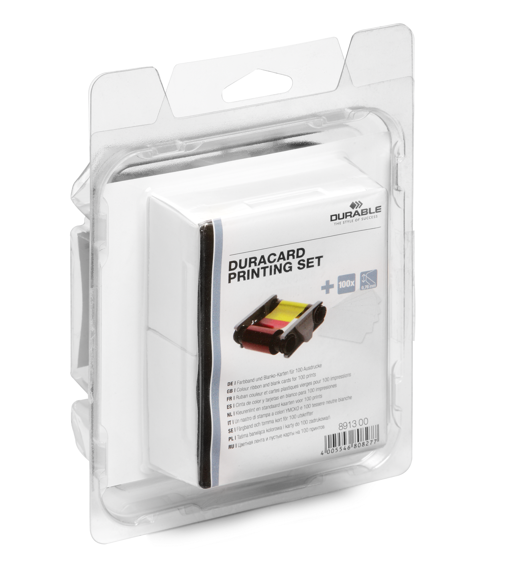 Sæt til plastkortprinter DURACARD ID 300 med YMCKO farvebånd til farveudskrivning (varenr. 891122) og 100 stk. standard kort i tykkelse 0,76mm (varenr. 891502).