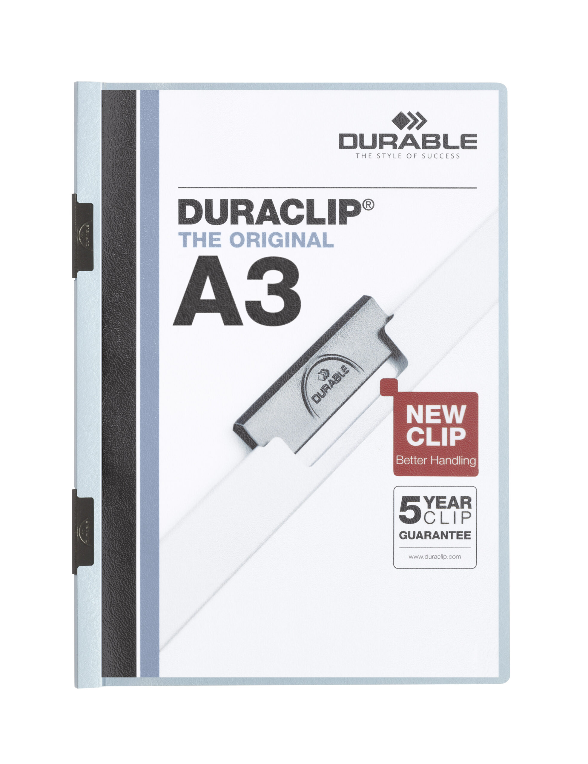 Universalmappen er perfekt til præsentationer, tilbud, rapporter osv. som ikke behøver at blive hullet. Den unikke metalklemme holder dokumenterne på plads. DURACLIP® A3 har en transparent forside og farvet bagside, to metalklemmer og kan rumme op til 60 A3 sider. Enkel at anvende: træk klemmen ud, læg dokumenterne i, skyd klemmen tilbage og dokumenterne sidder fast. Den unikke klemme tilpasser sig efter antallet af sider gang efter gang! 5 års garanti på klemmen. https://www.durable.dk/service/durable-garanti/duraclipr-garanti.html