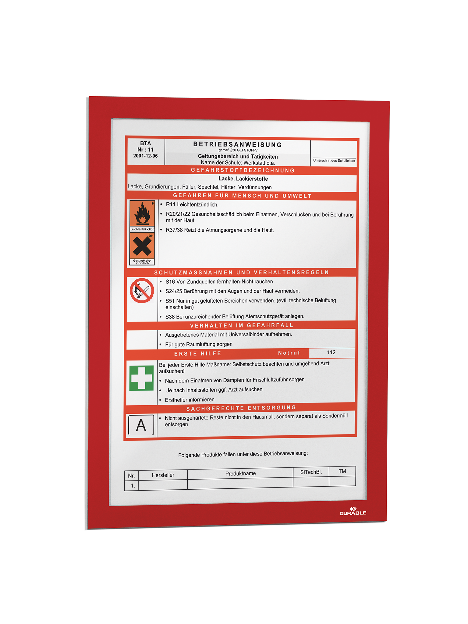 Den professionelle måde at annoncere. Den selvklæbende inforamme DURAFRAME® er den ideelle løsning for at vise oplysninger på solide og glatte overflader. • Viser oplysninger på en professionel og elegant måde • Hurtigt at installere og udskifte indholdet takket være den oplukkelige magnetisk ramme • Nemt at sætte op på faste og glatte overflader; kan fjernes igen fra glas • Anvendelsesområder: at vise og præsentere informationer i A4 format, f.eks. skilte, kampagnetilbud, reklamer, åbningstider • Ved anvendelse på glas, kan informationen læses fra begge sider • Rammen ser identisk ud fra begge sider • Til anvendelse i stående eller liggende format • Ydermål: 236 x 323 mm • Placering af selvklæbende DURAFRAME® inforammer på malet, coatede og laminerende overflader, anbefales ikke, da denne overflade kan blive beskadiget når rammen fjernes. Til disse overflader anbefaler vi DURAFRAME® WALLPAPER som findes i A3 og A4 formater. 2 stk/pose rød