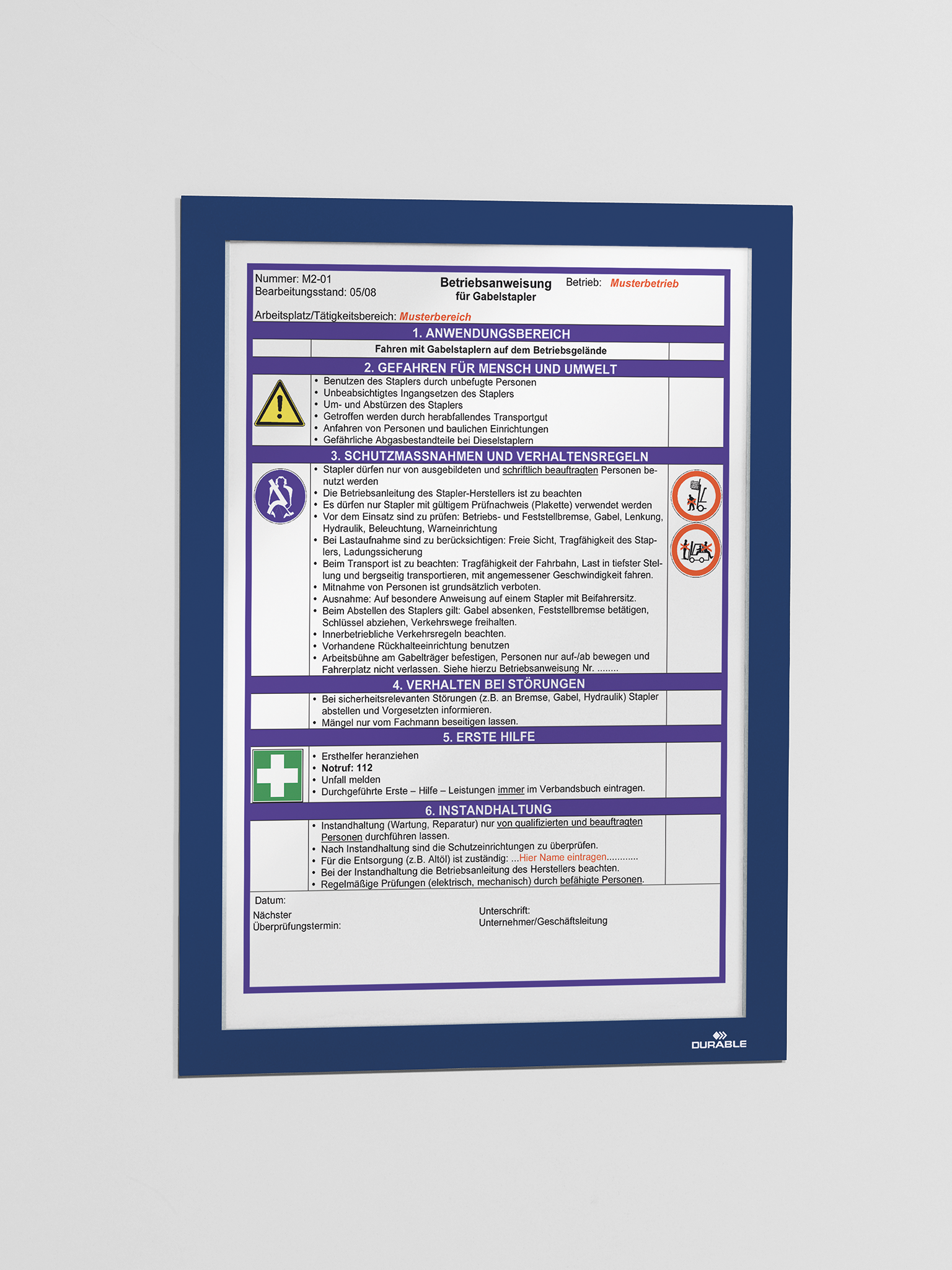 Den professionelle måde at annoncere. Den selvklæbende inforamme DURAFRAME® er den ideelle løsning for at vise oplysninger på solide og glatte overflader. • Viser oplysninger på en professionel og elegant måde • Hurtigt at installere og udskifte indholdet takket være den oplukkelige magnetisk ramme • Nemt at sætte op på faste og glatte overflader; kan fjernes igen fra glas • Anvendelsesområder: at vise og præsentere informationer i A4 format, f.eks. skilte, kampagnetilbud, reklamer, åbningstider • Ved anvendelse på glas, kan informationen læses fra begge sider • Rammen ser identisk ud fra begge sider • Til anvendelse i stående eller liggende format • Ydermål: 236 x 323 mm • Placering af selvklæbende DURAFRAME® inforammer på malet, coatede og laminerende overflader, anbefales ikke, da denne overflade kan blive beskadiget når rammen fjernes. Til disse overflader anbefaler vi DURAFRAME® WALLPAPER som findes i A3 og A4 formater. 2 stk/pose mørkblå