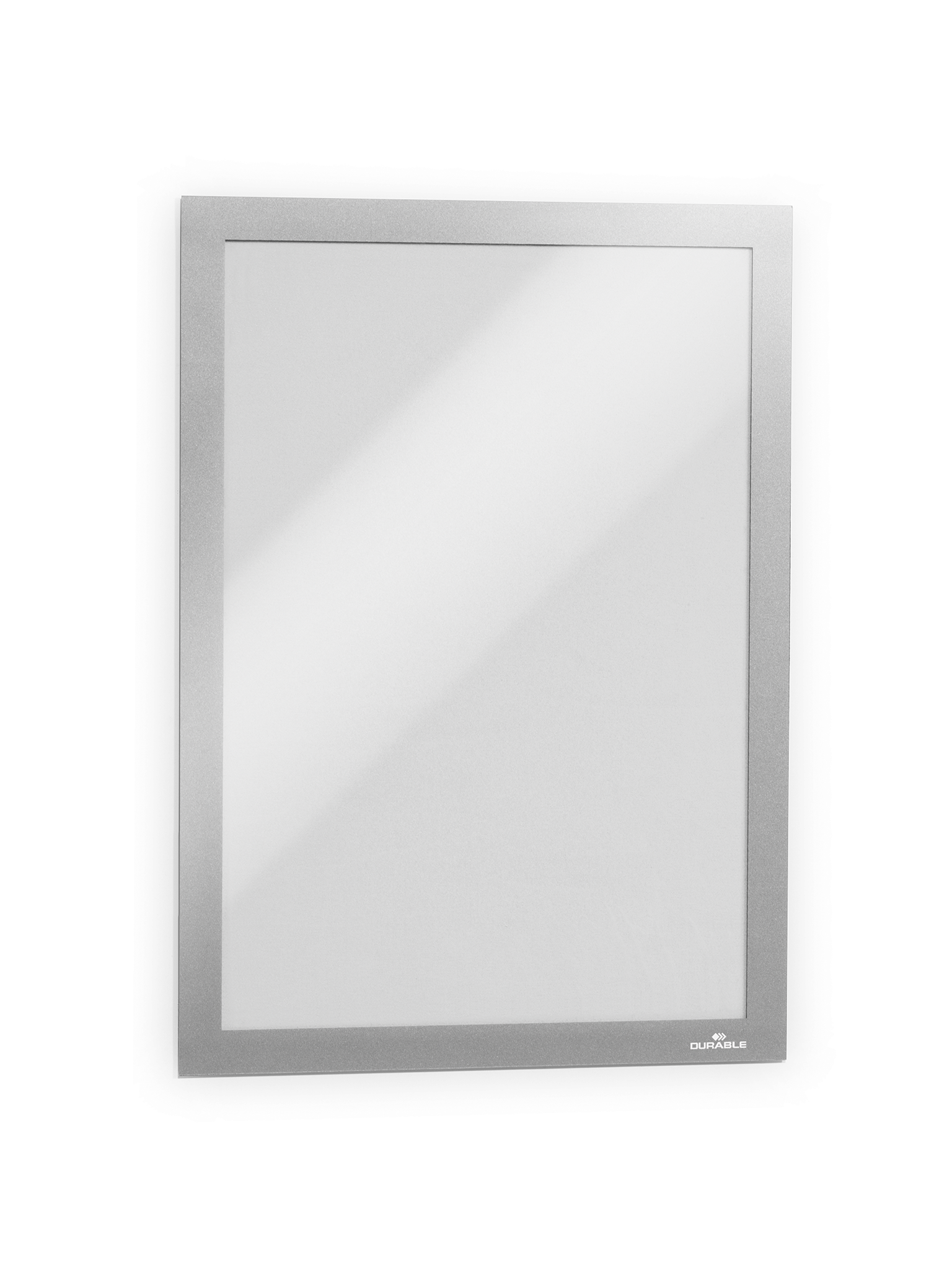 Den professionelle måde at annoncere. Den selvklæbende inforamme DURAFRAME® er den ideelle løsning for at vise oplysninger på solide og glatte overflader. • Viser oplysninger på en professionel og elegant måde • Hurtigt at installere og udskifte indholdet takket være den oplukkelige magnetisk ramme • Nemt at sætte op på faste og glatte overflader; kan fjernes igen fra glas • Anvendelsesområder: at vise og præsentere informationer i A4 format, f.eks. skilte, kampagnetilbud, reklamer, åbningstider • Ved anvendelse på glas, kan informationen læses fra begge sider • Rammen ser identisk ud fra begge sider • Til anvendelse i stående eller liggende format • Ydermål: 236 x 323 mm • Placering af selvklæbende DURAFRAME® inforammer på malet, coatede og laminerende overflader, anbefales ikke, da denne overflade kan blive beskadiget når rammen fjernes. Til disse overflader anbefaler vi DURAFRAME® WALLPAPER som findes i A3 og A4 formater. 1 stk/pose (blisterpak) sølv