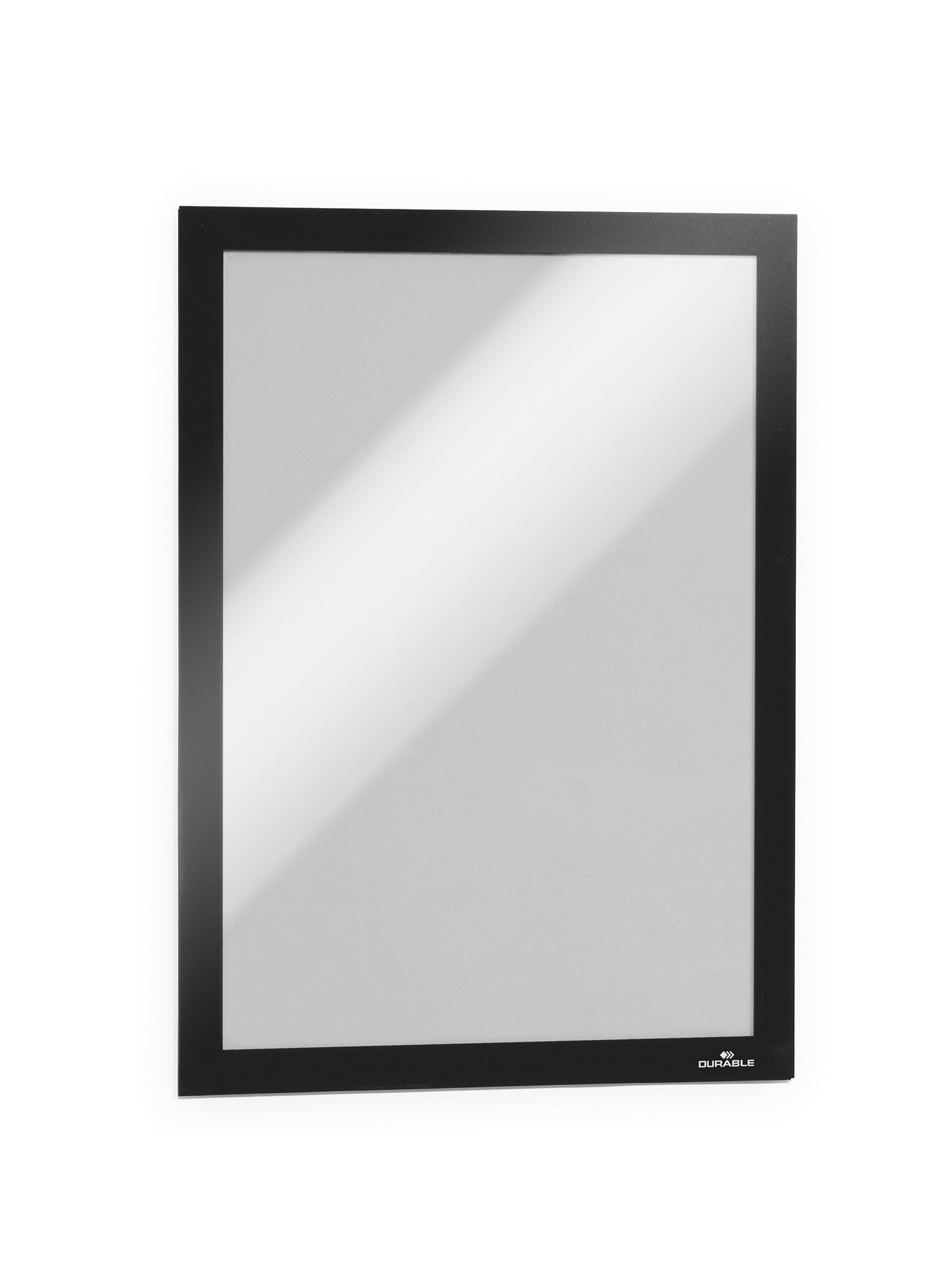 Den professionelle måde at annoncere. Den selvklæbende inforamme DURAFRAME® er den ideelle løsning for at vise oplysninger på solide og glatte overflader. • Viser oplysninger på en professionel og elegant måde • Hurtigt at installere og udskifte indholdet takket være den oplukkelige magnetisk ramme • Nemt at sætte op på faste og glatte overflader; kan fjernes igen fra glas • Anvendelsesområder: at vise og præsentere informationer i A4 format, f.eks. skilte, kampagnetilbud, reklamer, åbningstider • Ved anvendelse på glas, kan informationen læses fra begge sider • Rammen ser identisk ud fra begge sider • Til anvendelse i stående eller liggende format • Ydermål: 236 x 323 mm • Placering af selvklæbende DURAFRAME® inforammer på malet, coatede og laminerende overflader, anbefales ikke, da denne overflade kan blive beskadiget når rammen fjernes. Til disse overflader anbefaler vi DURAFRAME® WALLPAPER som findes i A3 og A4 formater. 2 stk/pose sort