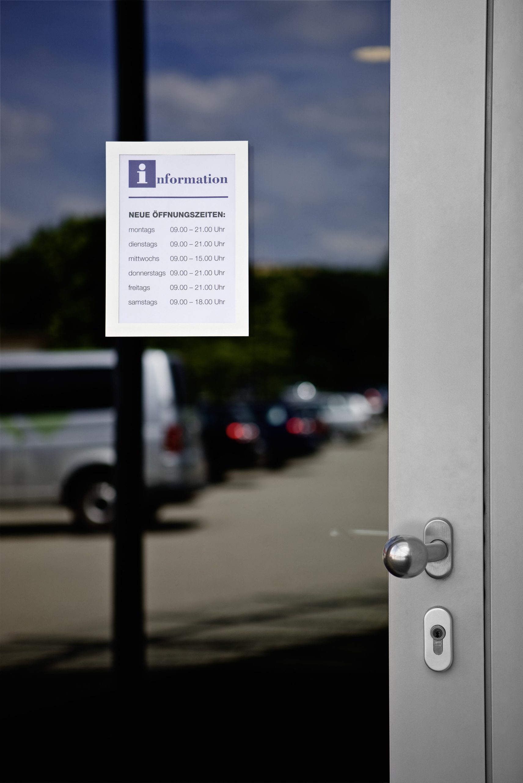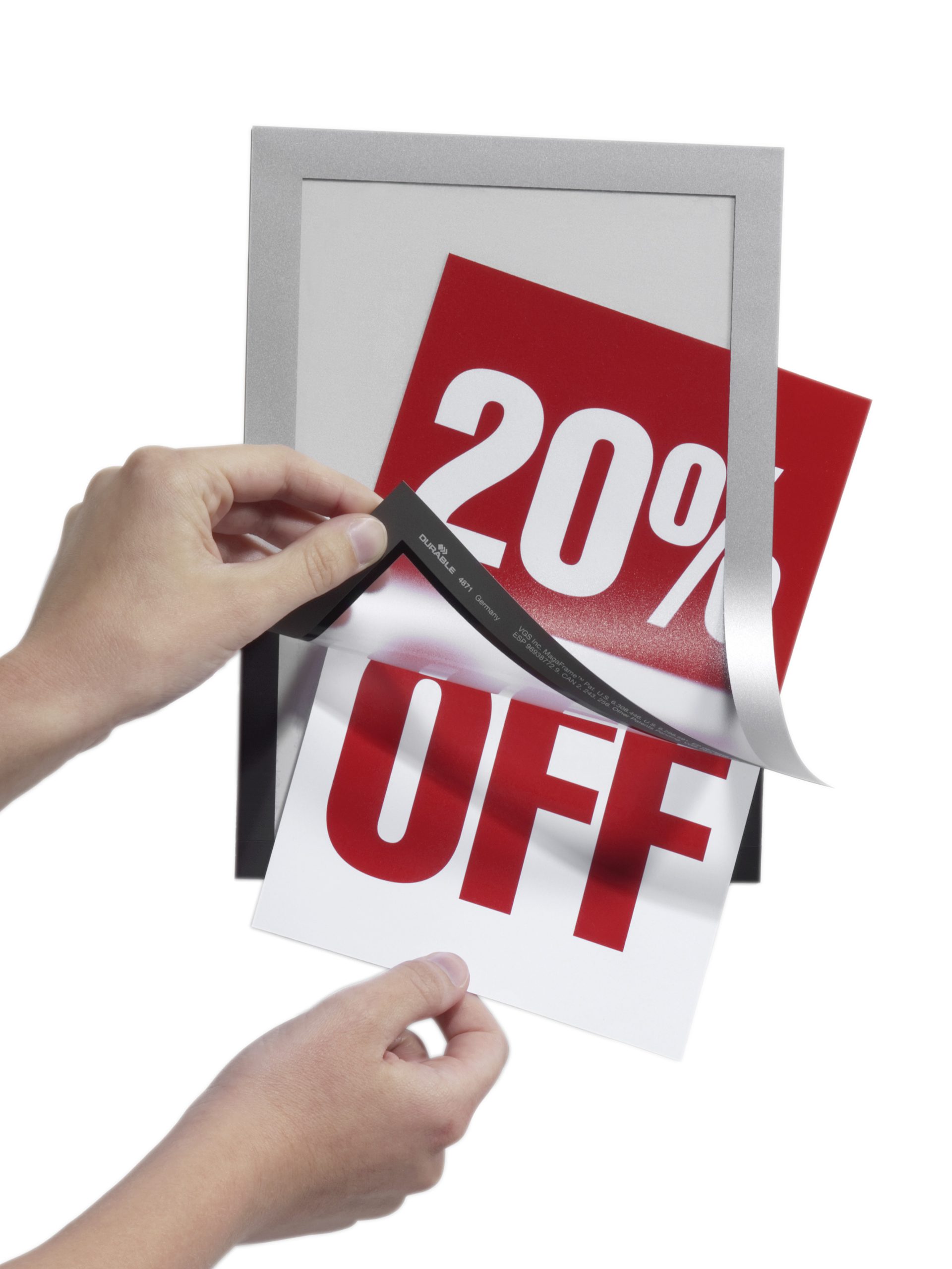 Den professionelle måde at annoncere. Den selvklæbende inforamme DURAFRAME® er den ideelle løsning for at vise oplysninger på solide og glatte overflader. • Viser oplysninger på en professionel og elegant måde • Hurtigt at installere og udskifte indholdet takket være den oplukkelige magnetisk ramme • Nemt at sætte op på faste og glatte overflader; kan fjernes igen fra glas • Anvendelsesområder: at vise og præsentere informationer i A5 format, f.eks. skilte, kampagnetilbud, reklamer, åbningstider • Ved anvendelse på glas, kan informationen læses fra begge sider • Rammen ser identisk ud fra begge sider • Til anvendelse i stående eller liggende format • Ydermål: 236 x 176 mm • Placering af selvklæbende DURAFRAME® inforammer på malet, coatede og laminerende overflader, anbefales ikke, da denne overflade kan blive beskadiget når rammen fjernes. Til disse overflader anbefaler vi DURAFRAME® WALLPAPER som findes i A3 og A4 formater. 10 stk/pose sølv