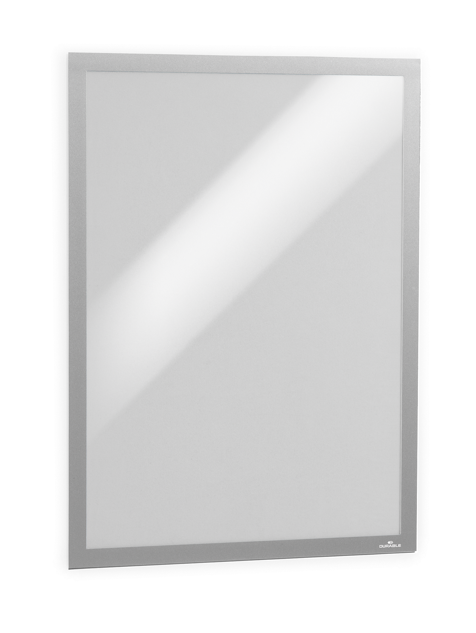 Benyt DURAFRAME® POSTER inforamme til at vise og præsentere salgsfremmende tilbud, åbningstider, reklamer osv. på en professionel måde i butiksvinduer, på vægge eller glasvægge. Rammen holdes sammen med flade magneter langs de lange sider, og det er nemt at indsætte eller ændre beskeder ved at løfte fronten. Let at sætte op – glat og pænt uden bobler – med to selvklæbende strimler på bagsidens korte sider. Plakatrammen kan fjernes fra glatte og faste overflader uden at efterlade rester. Det ser bedre ud end tape! Rammen har plads til 2 plakater (150gr papir) og kan læses fra begge sider med den samme flotte ramme på forsiden som på bagsiden. Fremstillet af PET-plast. Varmebestandig op til 70° og UV-stabil i op til 2 år. Til plakater i A2-format i høj- eller tværformat. Udvendige mål 465 x 639 mm. Farve: sølv Praktisk pladsbesparende emballage med 1 sammenrullet ramme