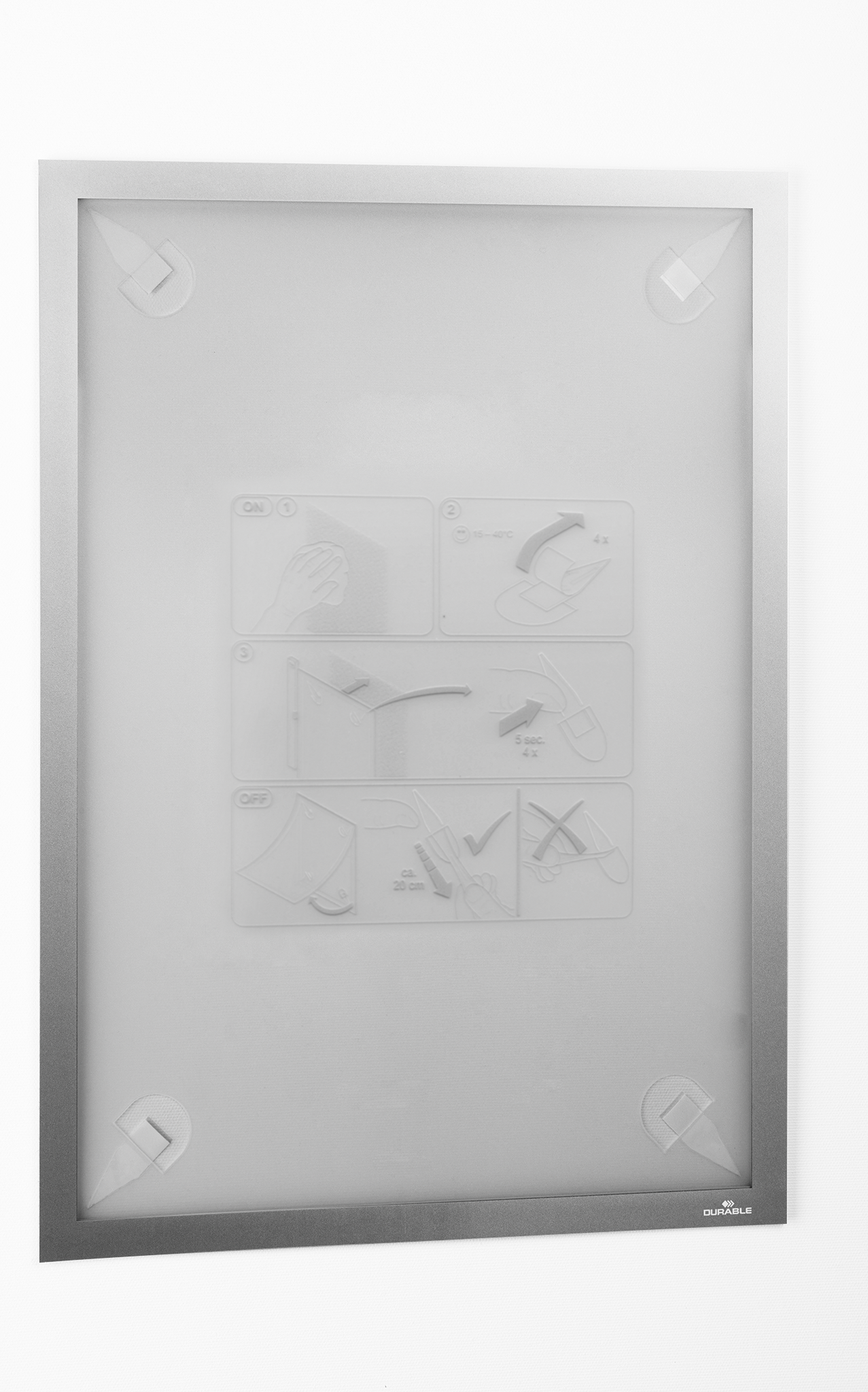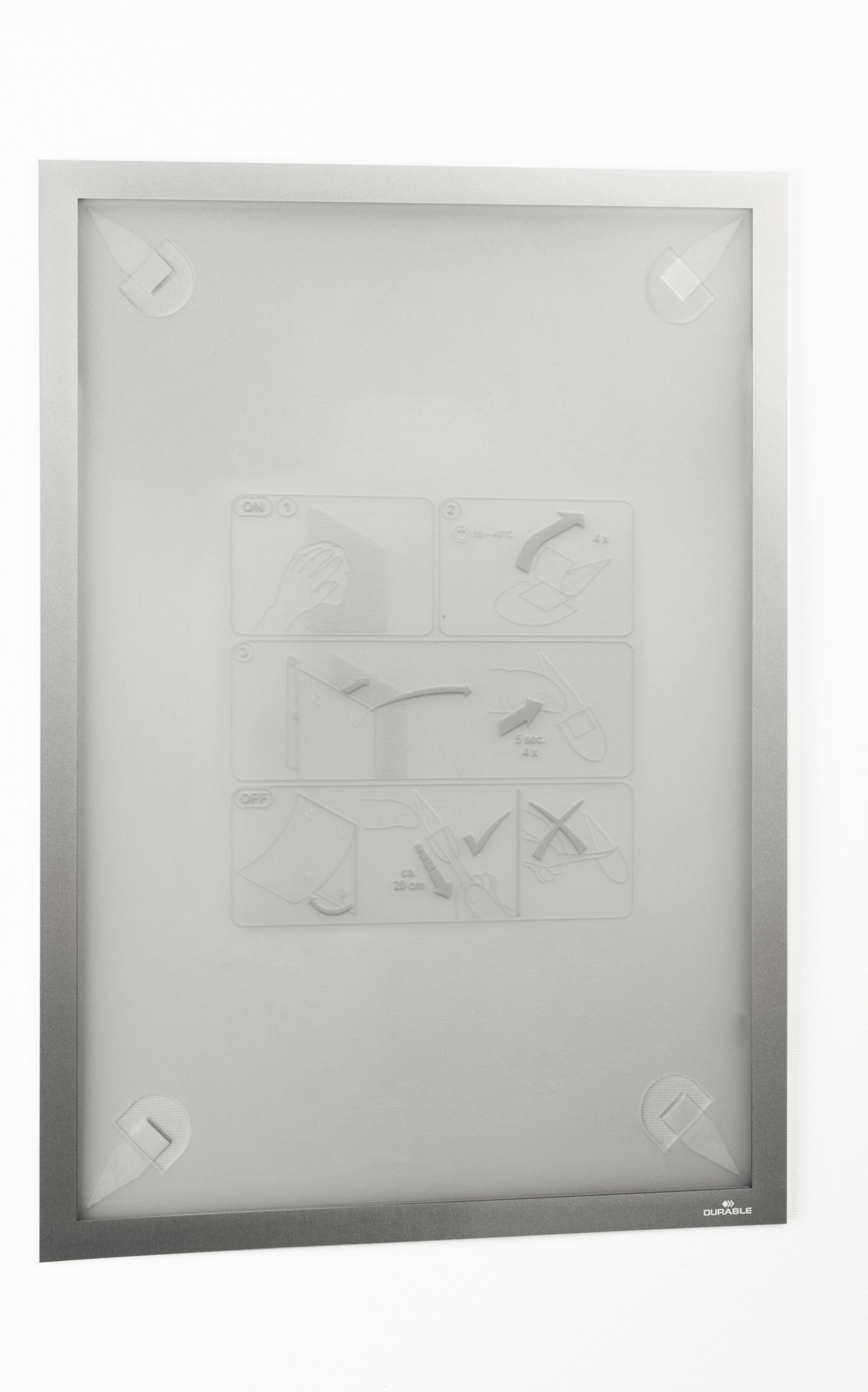 Den professionelle måde at annoncere. Den flytbare inforamme DURAFRAME® WALLPAPER til informationer på følsomme overflader. Ideel til meddelelser på tapet, træ og plastoverflader. • Viser oplysninger på en professionel og elegant måde. • Hurtigt at installere og udskifte indholdet takket være den oplukkelige magnetiske ramme. •Nemt at opsætte på tapet, træ og de fleste plastoverflader med klæbende strips. • DURAFRAME®WALLPAPER kan fjernes igen og efterlader ingen klæberester eller beskadiger overfladen. •Anvendelsesområder: at vise og præsenterer informationer i A3 format, f.eks. skilte, kampagnetilbud, reklamer, åbningstider. •Inklusiv udskiftningssæt med 4 klæbende strips. • Til anvendelse i stående eller liggende format. •Mål: 323 x 446 mm