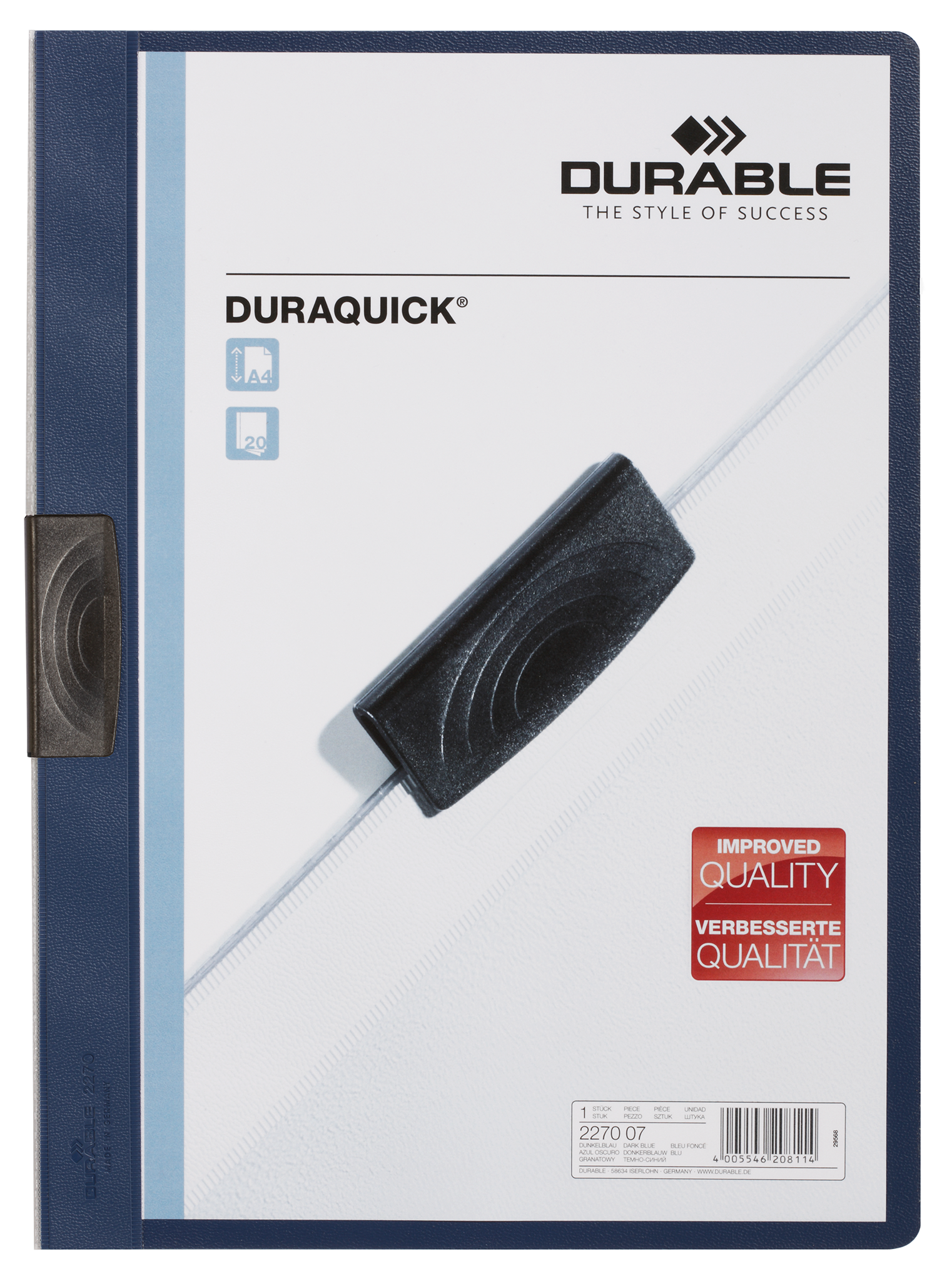 Universalmappen er perfekt til præsentationer, tilbud, rapporter osv. som ikke behøver at blive hullet. Klemme i plast holder dokumenterne på plads. DURAQUICK® er fremstillet af polypropylen og har en transparent forside og farvet bagside, og kan rumme op til 30 A4 sider. Enkel at anvende: træk klemmen ud, læg dokumenterne i, skyd klemmen tilbage og dokumenterne sidder fast.