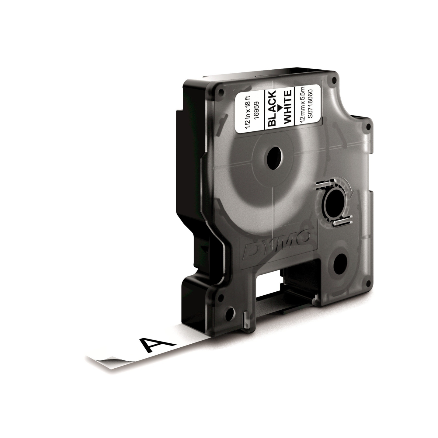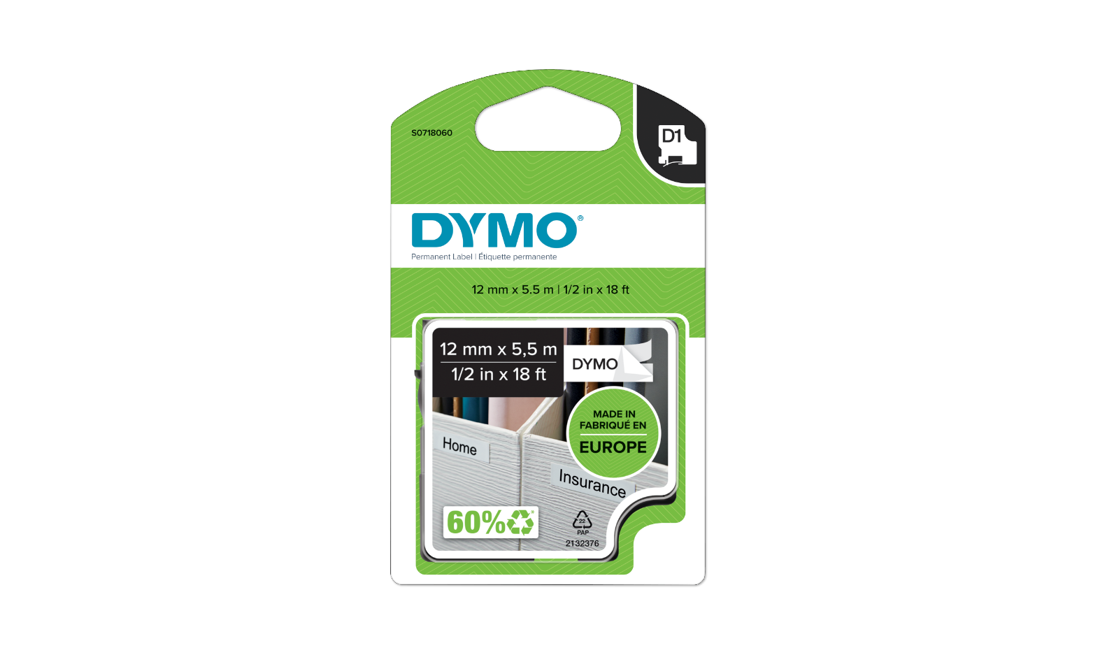 DYMO D1 tape permanent polyester sort/hvid 12mm x 5,5m. DYMO D1®-etiketter er skabt specifikt til dine LabelManager®- og LabelWriter® Duo-etiketmaskiner. DYMO permanent polyester D1 tape er permanent klæbende og anvendes til mærkning af paneler, klemmerækker, frontpaneler, hylder, kasser, beholdere, reoler mm. Har en blank finish til professionel etiketmærkning og er yderst modstandsdygtig overfor opløsningsmidler og kemikalier. DYMO går meget op i miljøet, og tænker på genbrug. Derfor producere vi denne tape i Europa. Emballagen til denne DYMO tape lavet af minimum 60% genbrugsmateriale, og plastik kassetten er lavet af minimum 80% genanvendt plastik.