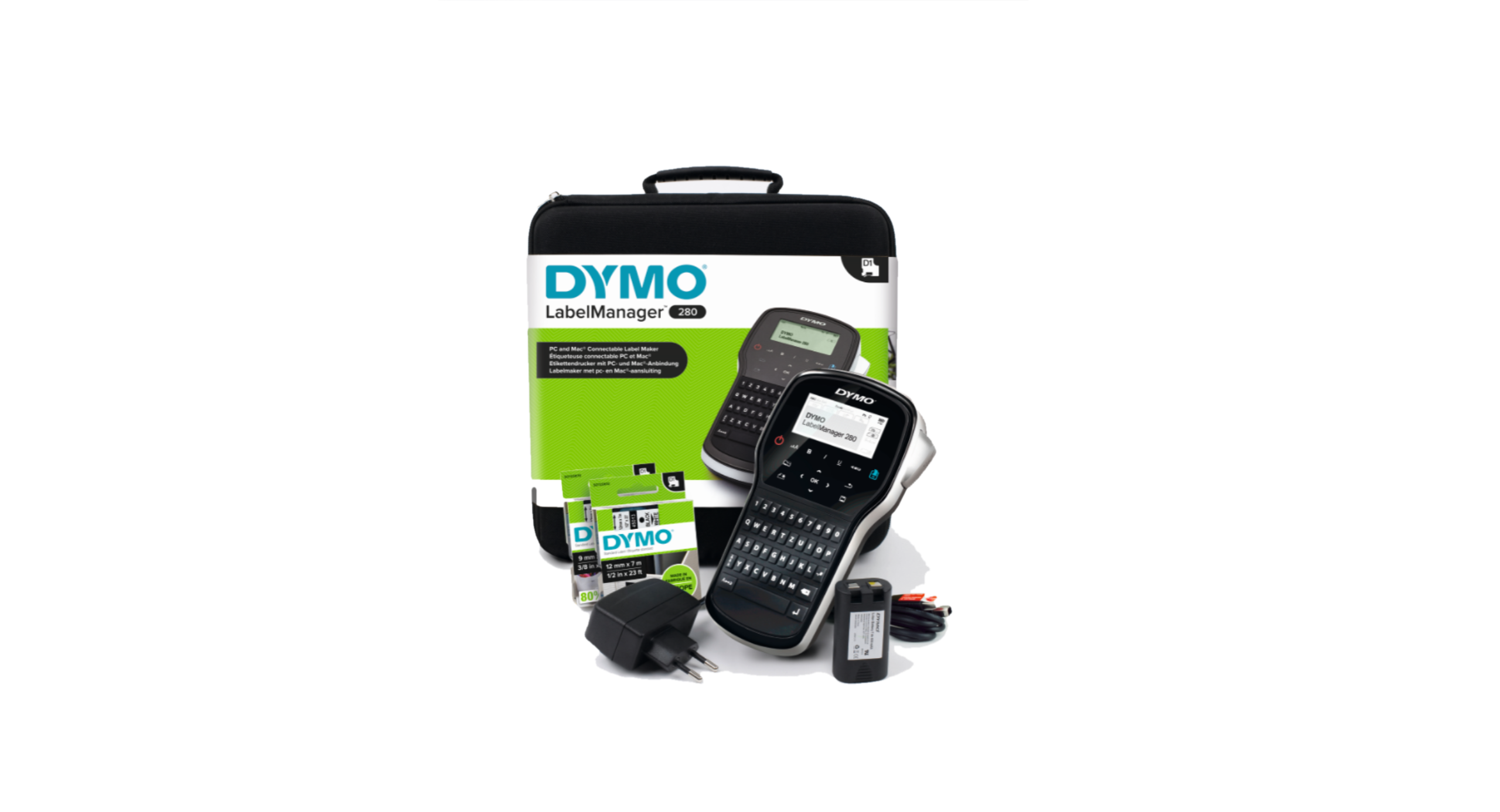 DYMO LabelManager 280 etiketmaskine kit. Med et stort grafisk display, taster til hurtig formatering og et genopladeligt batteri, der holder længe, er LabelManager 280 din billet til hurtig, uafbrudt etiketfremstilling. Computertastaturet er perfekt til at skrive tekst hurtigt, bekvemt og let. Og med tilslutning til pc eller Mac®* kan du tilpasse etiketter til skrifttyper og grafik, du selv vælger fra din computer. LabelManager 280 udskriver DYMO D1-etiketter i bredder på 6 mm, 9 mm og 12 mm i varierende farver perfekt til etiketmærkning af dine arkiver, reoler, udstyr m.m. Med i pakken følger: 1x DYMO LabelManager 280, 1x D1 tape 12mm – sort på hvid, 1x D1 tape 9mm – sort på transparent, 1x USB kabel, 1x Li-Ion genopladeligt batteri, 1x strømforsyning, 1x soft case opbevaringskuffert samt Quick Start Guide. DYMO går meget op i miljøet, og tænker på genbrug. Alle DYMO®-etiketter er fremstillet i Europa. DYMO D1 plastik kassetten er lavet af minimum 80% genanvendt plastik.