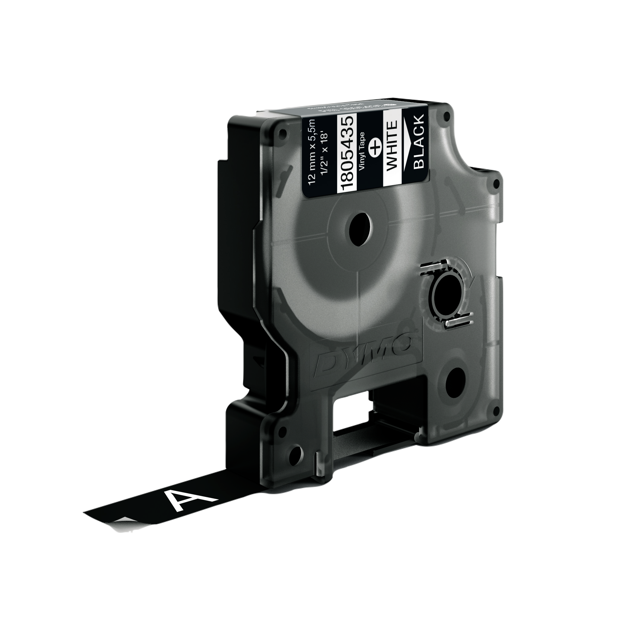 DYMO Rhino industri tape vinyl tape 12mm x 5,5m rulle hvid på sort selvklæbende. DYMO Rhino IND-vinyltape kombinerer fleksibilitet, en stærk lim og en høj kemisk resistens, hvilket gør denne tape velegnet til mange type applikationer. Til generel etiketmærkning eller ekstreme omgivelser, vinyletiketter, som er modstandsdygtige over for fugt, kemikalier og UV-stråling, og som er ideelle til mærkning både inden og uden døre. For at lette påsætningen har tapene slids i bagpapiret, så det let fjernes inden påsætning ( dog ikke 6 mm) Tåler -30gr C- +150gr C og vand, olie og fedtstof samt svagere opløsningsmidler. Opfylder de vigtigste farvestandarder ifølge OSHA, ANSI og ISO. DYMO går meget op i miljøet, og tænker på genbrug. Derfor producere vi denne tape i Europa. Emballagen til denne DYMO tape lavet af minimum 80% genbrugsmateriale, og plastik kassetten er lavet af minimum 75% genanvendt plastik.