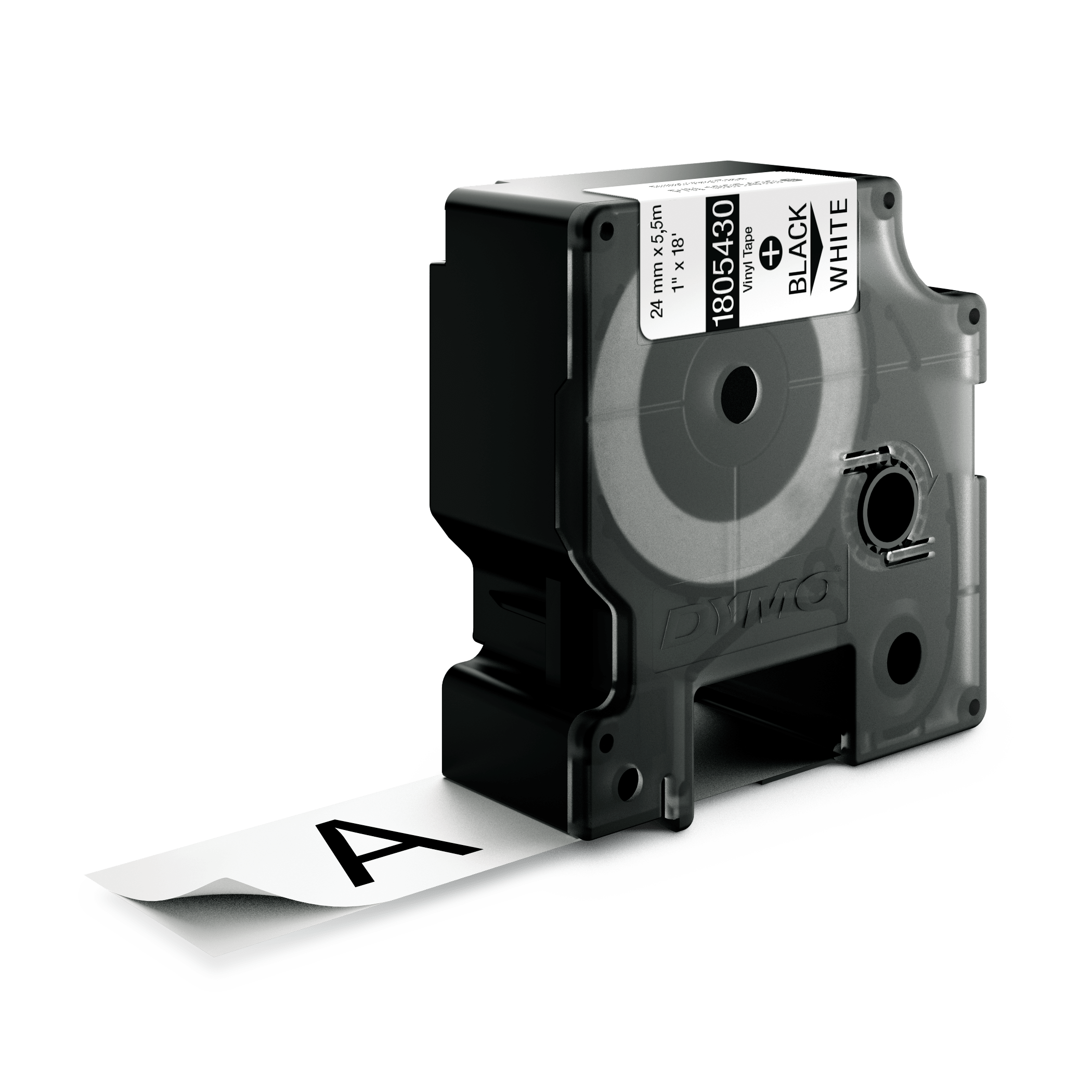 DYMO Rhino industri tape vinyl tape 24mm x 5,5m rulle sort på hvid selvklæbende. DYMO Rhino IND-vinyltape kombinerer fleksibilitet, en stærk lim og en høj kemisk resistens, hvilket gør denne tape velegnet til mange type applikationer. Til generel etiketmærkning eller ekstreme omgivelser, vinyletiketter, som er modstandsdygtige over for fugt, kemikalier og UV-stråling, og som er ideelle til mærkning både inden og uden døre. For at lette påsætningen har tapene slids i bagpapiret, så det let fjernes inden påsætning ( dog ikke 6 mm) Tåler -30gr C- +150gr C og vand, olie og fedtstof samt svagere opløsningsmidler. Opfylder de vigtigste farvestandarder ifølge OSHA, ANSI og ISO. DYMO går meget op i miljøet, og tænker på genbrug. Derfor producere vi denne tape i Europa. Emballagen til denne DYMO tape lavet af minimum 80% genbrugsmateriale, og plastik kassetten er lavet af minimum 75% genanvendt plastik.