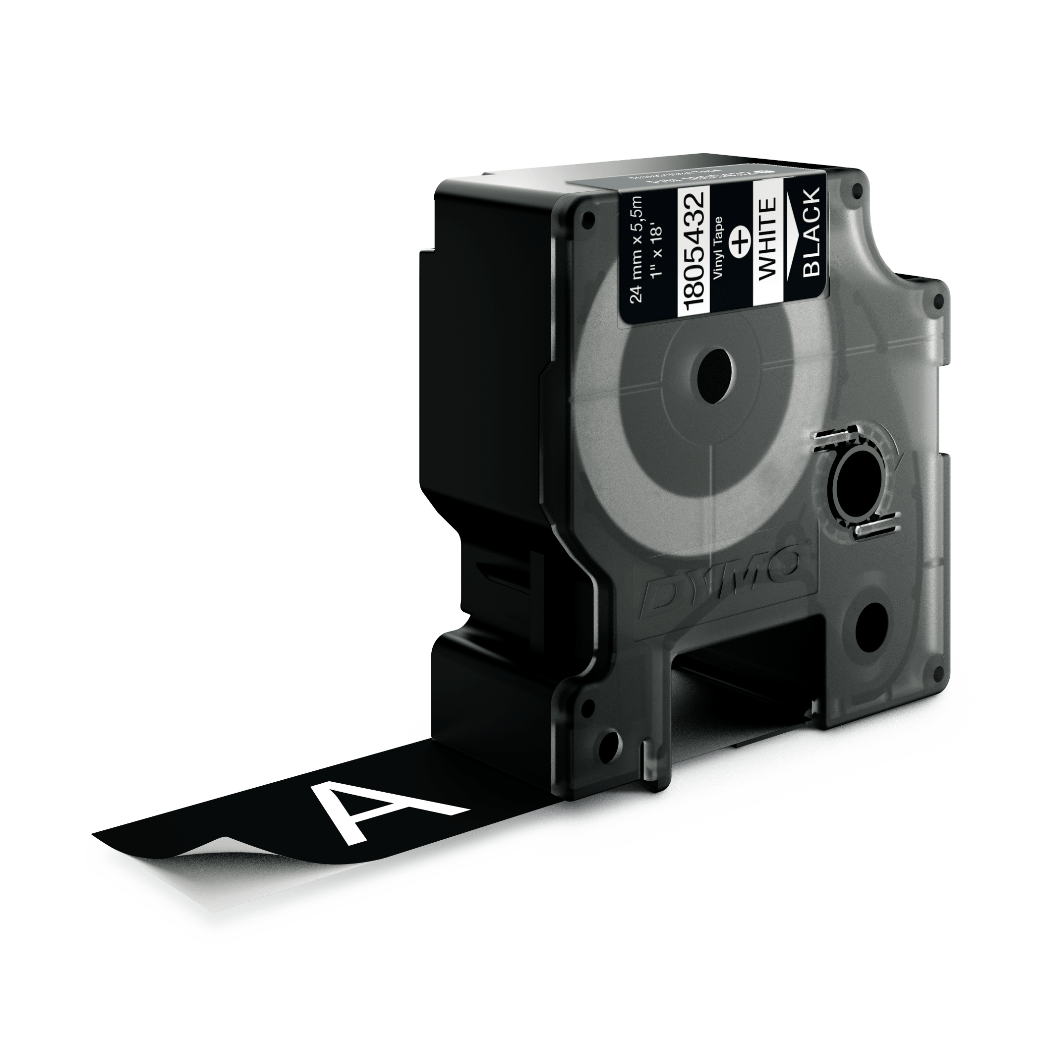 DYMO Rhino industri tape vinyl tape 24mm x 5,5m rulle hvid på sort selvklæbende. DYMO Rhino IND-vinyltape kombinerer fleksibilitet, en stærk lim og en høj kemisk resistens, hvilket gør denne tape velegnet til mange type applikationer. Til generel etiketmærkning eller ekstreme omgivelser, vinyletiketter, som er modstandsdygtige over for fugt, kemikalier og UV-stråling, og som er ideelle til mærkning både inden og uden døre. For at lette påsætningen har tapene slids i bagpapiret, så det let fjernes inden påsætning ( dog ikke 6 mm) Tåler -30gr C- +150gr C og vand, olie og fedtstof samt svagere opløsningsmidler. Opfylder de vigtigste farvestandarder ifølge OSHA, ANSI og ISO. DYMO går meget op i miljøet, og tænker på genbrug. Derfor producere vi denne tape i Europa. Emballagen til denne DYMO tape lavet af minimum 80% genbrugsmateriale, og plastik kassetten er lavet af minimum 75% genanvendt plastik.