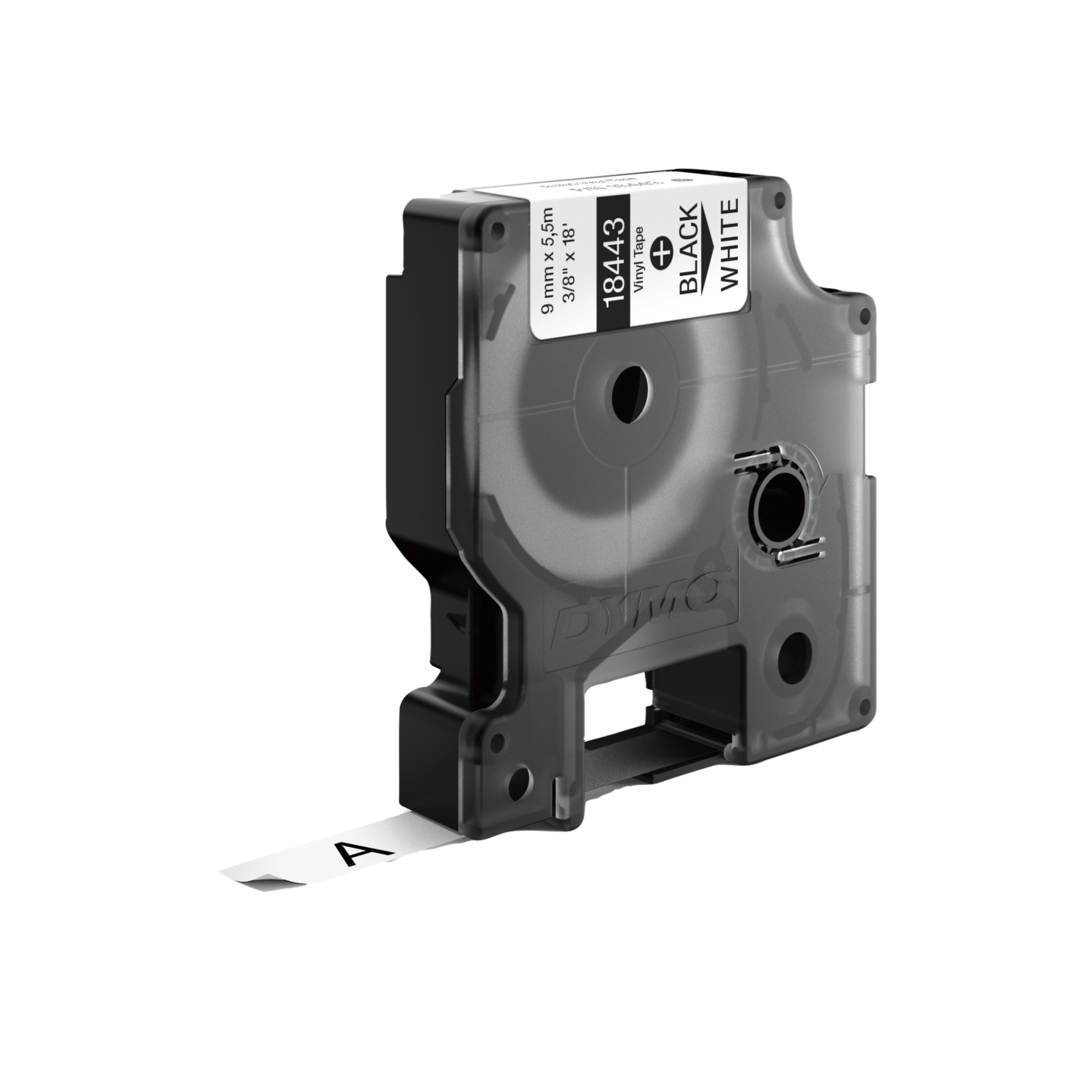 DYMO Rhino industri tape vinyl sort på hvid 9mm x 5,5m. DYMO Rhino IND-vinyltape kombinerer fleksibilitet, en stærk lim og en høj kemisk resistens, hvilket gør denne tape velegnet til mange type applikationer. Til generel etiketmærkning eller ekstreme omgivelser, vinyletiketter, som er modstandsdygtige over for fugt, kemikalier og UV-stråling, og som er ideelle til mærkning både inden og uden døre. For at lette påsætningen har tapene slids i bagpapiret, så det let fjernes inden påsætning ( dog ikke 6 mm) Tåler -30gr C- +150gr C og vand, olie og fedtstof samt svagere opløsningsmidler. Opfylder de vigtigste farvestandarder ifølge OSHA, ANSI og ISO. DYMO går meget op i miljøet, og tænker på genbrug. Derfor producere vi denne tape i Europa. Emballagen til denne DYMO tape lavet af minimum 80% genbrugsmateriale, og plastik kassetten er lavet af minimum 75% genanvendt plastik.