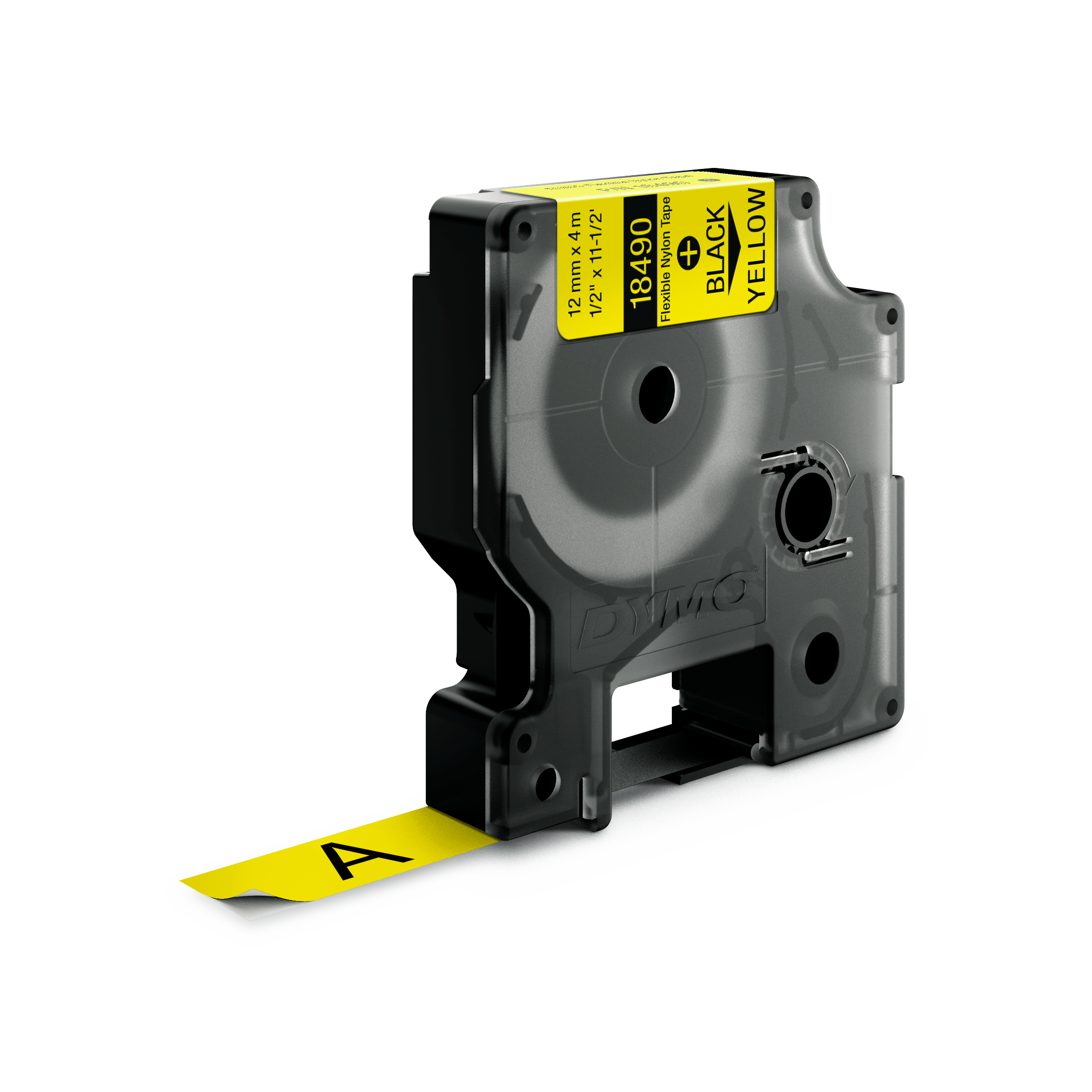 DYMO Rhino industri tape fleksibel nylon sort på gul 12mm x 3,5m. DYMO Rhino fleksible nylonetiketter er specifikt designet til buede overflader og mærkning af ledninger og kabler, og etiketterne sidder godt fast på ledninger, kabler, buede og strukturerede overflader. Printteknik med termisk overførsel betyder, at etiketterne er tværefaste og ikke falmer. DYMO går meget op i miljøet, og tænker på genbrug. Derfor producere vi denne tape i Europa. Emballagen til denne DYMO tape lavet af minimum 80% genbrugsmateriale, og plastik kassetten er lavet af minimum 75% genanvendt plastik.