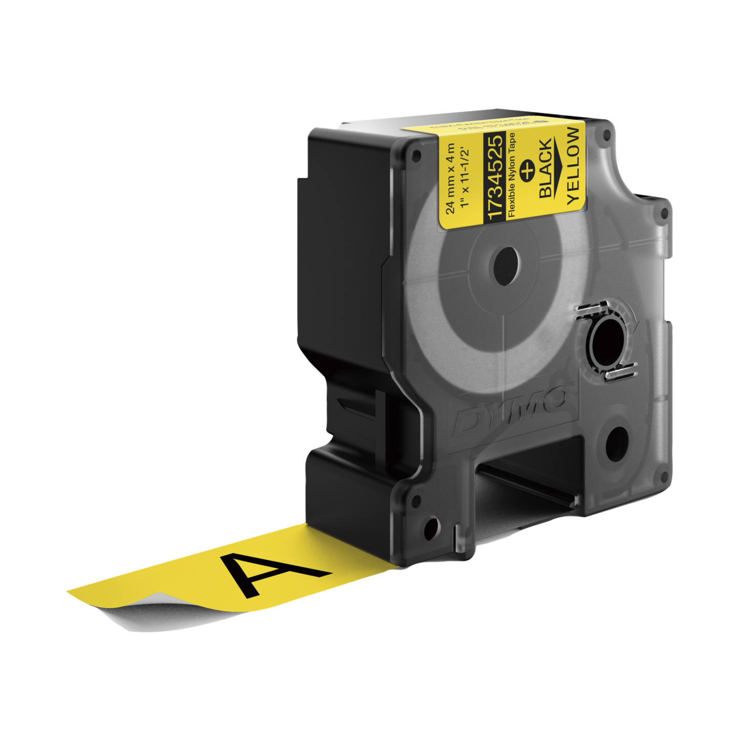 DYMO Rhino industri tape fleksibel nylon sort på gul 24mm x 3,5m. DYMO Rhino IND fleksible nylonetiketter er specifikt designet til buede overflader og mærkning af ledninger og kabler, og etiketterne sidder godt fast på ledninger, kabler, buede og strukturerede overflader. Printteknik med termisk overførsel betyder, at etiketterne er tværefaste og ikke falmer. DYMO går meget op i miljøet, og tænker på genbrug. Derfor producere vi denne tape i Europa. Emballagen til denne DYMO tape lavet af minimum 80% genbrugsmateriale, og plastik kassetten er lavet af minimum 75% genanvendt plastik.