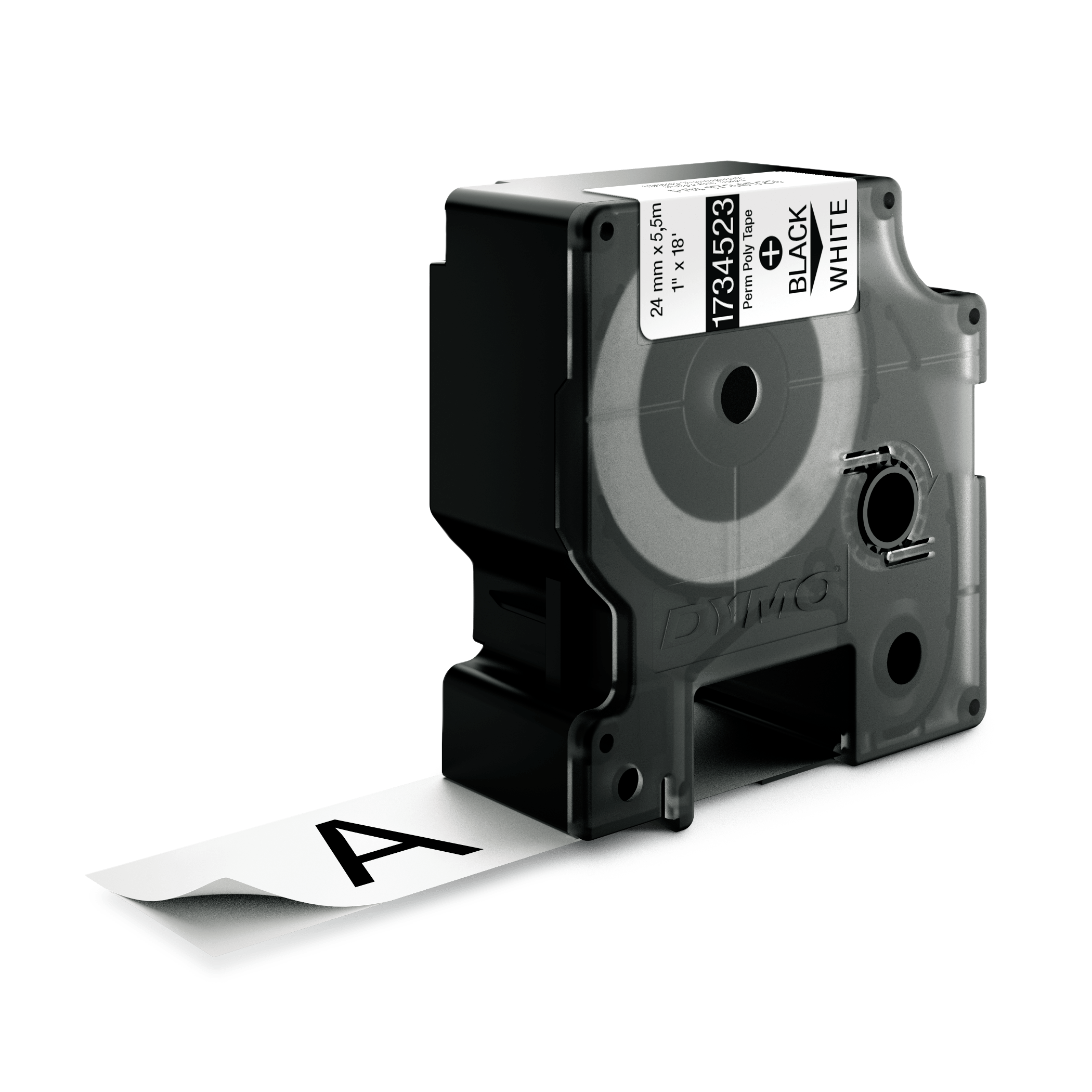 DYMO Rhino industri tape permanent polyester sort på klar 24mm x 5,5m. DYMO Rhino IND-permanent polyester anvendes til mærkning af paneler, klemmerækker, frontpaneler, hylder, kasser, beholdere, reoler mm. Har en blank finish til professionel etiketmærkning og er yderst modstandsdygtig overfor opløsningsmidler og kemikalier. UL-godkendt som komponent ifølge UL 969. Klæbemiddel i industrikvalitet, temperaturbestandig fra – 40C til + 150C. DYMO går meget op i miljøet, og tænker på genbrug. Derfor producere vi denne tape i Europa. Emballagen til denne DYMO tape lavet af minimum 80% genbrugsmateriale, og plastik kassetten er lavet af minimum 75% genanvendt plastik.