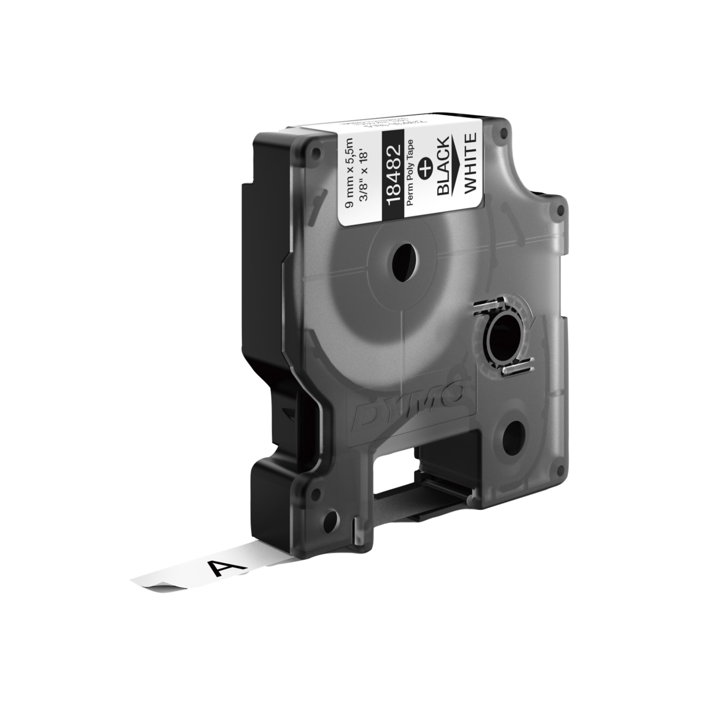 DYMO Rhino industri tape permanent polyester sort på hvid 9mm x 5,5m. DYMO Rhino IND-permanent polyester anvendes til mærkning af paneler, klemmerækker, frontpaneler, hylder, kasser, beholdere, reoler mm. Har en blank finish til professionel etiketmærkning og er yderst modstandsdygtig overfor opløsningsmidler og kemikalier. UL-godkendt som komponent ifølge UL 969. Klæbemiddel i industrikvalitet, temperaturbestandig fra – 40C til + 150C. DYMO går meget op i miljøet, og tænker på genbrug. Derfor producere vi denne tape i Europa. Emballagen til denne DYMO tape lavet af minimum 80% genbrugsmateriale, og plastik kassetten er lavet af minimum 75% genanvendt plastik.