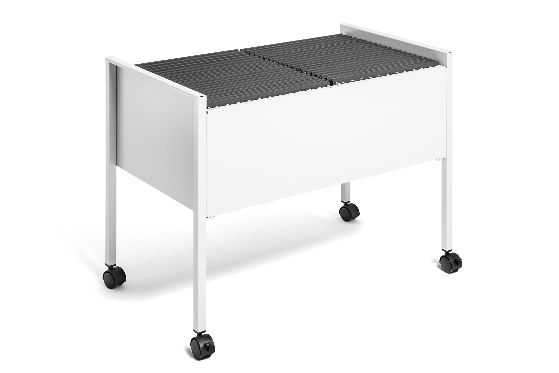 Hængemappevogn til ca. 100 stk. A4-hængemapper. Udstyret med fire hjul, to med bremser til stabilitet under brug. Af epoxy polyester belagt stål til at give ridsefast overflade. Leveres flad pakket med monteringsvejledning. Mål:BxHxD 760x592x425