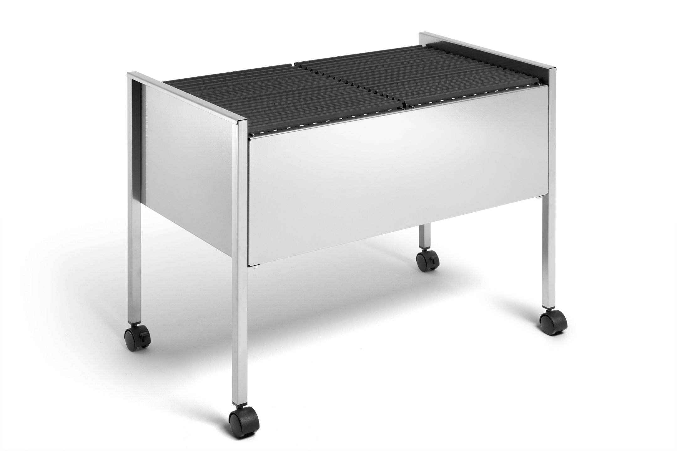 Hængemappevogn til ca. 100 stk. A4-hængemapper. Udstyret med fire hjul, to med bremser til stabilitet under brug. Af epoxy polyester belagt stål til at give ridsefast overflade. Leveres flad pakket med monteringsvejledning. Mål:BxHxD 760x592x425