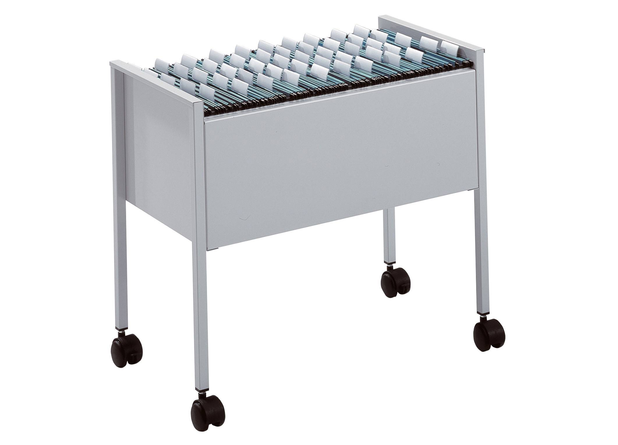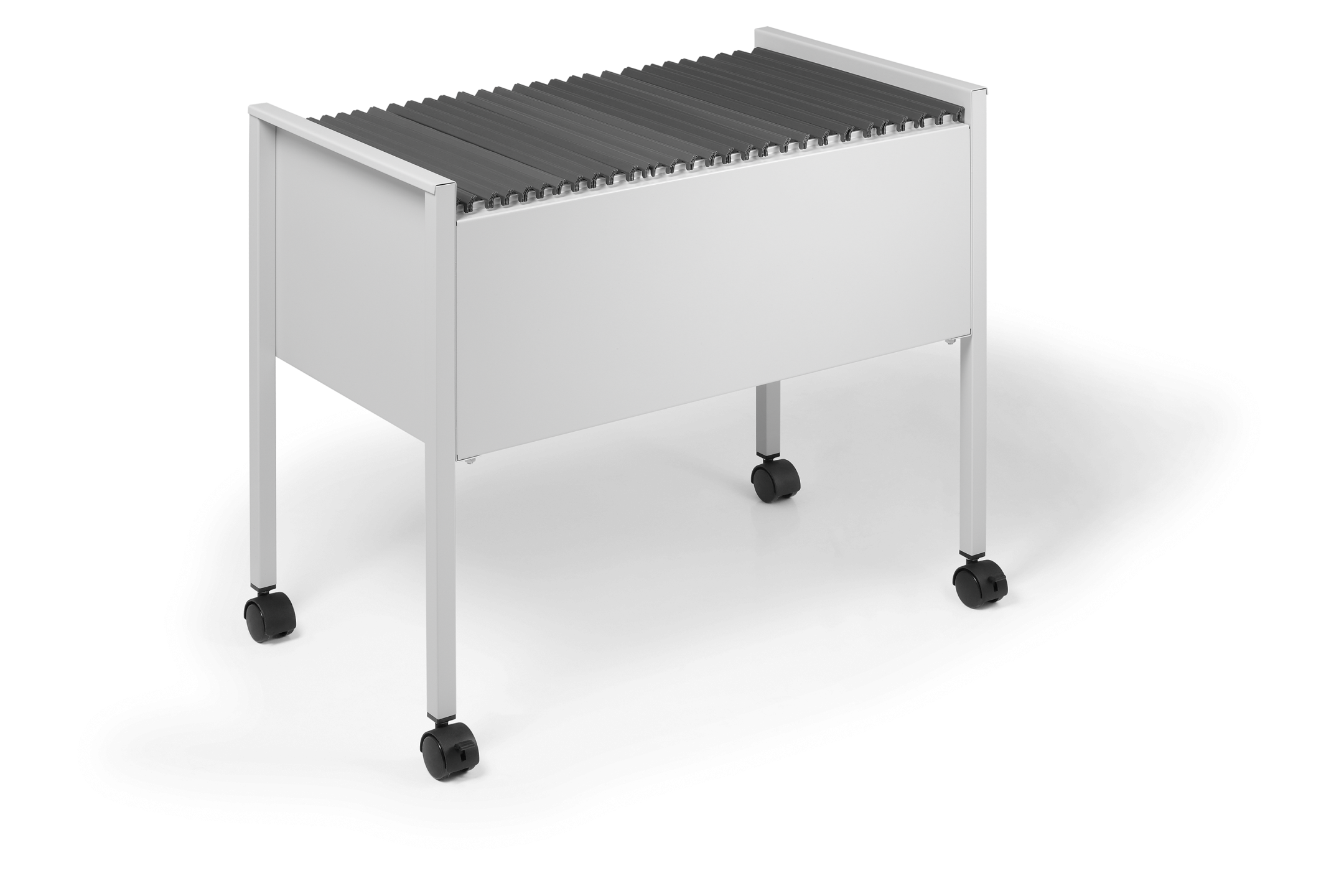 Hængemappevogn til ca. 80 stk. A4-hængemapper. Udstyret med fire hjul, to med bremser til stabilitet under brug. Af epoxy polyester belagt stål til at give ridsefast overflade. Leveres flad pakket med monteringsvejledning. Mål:BxHxD 655x592x368