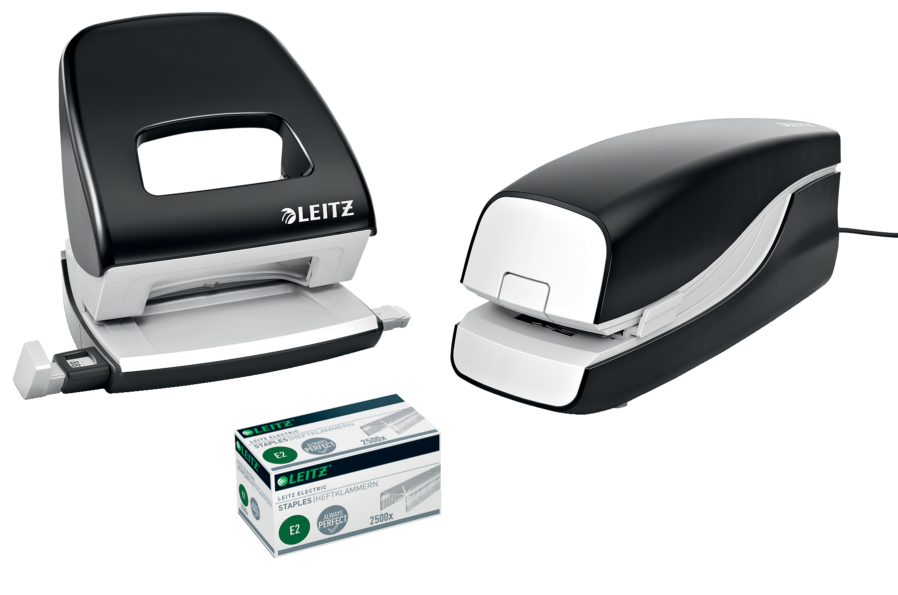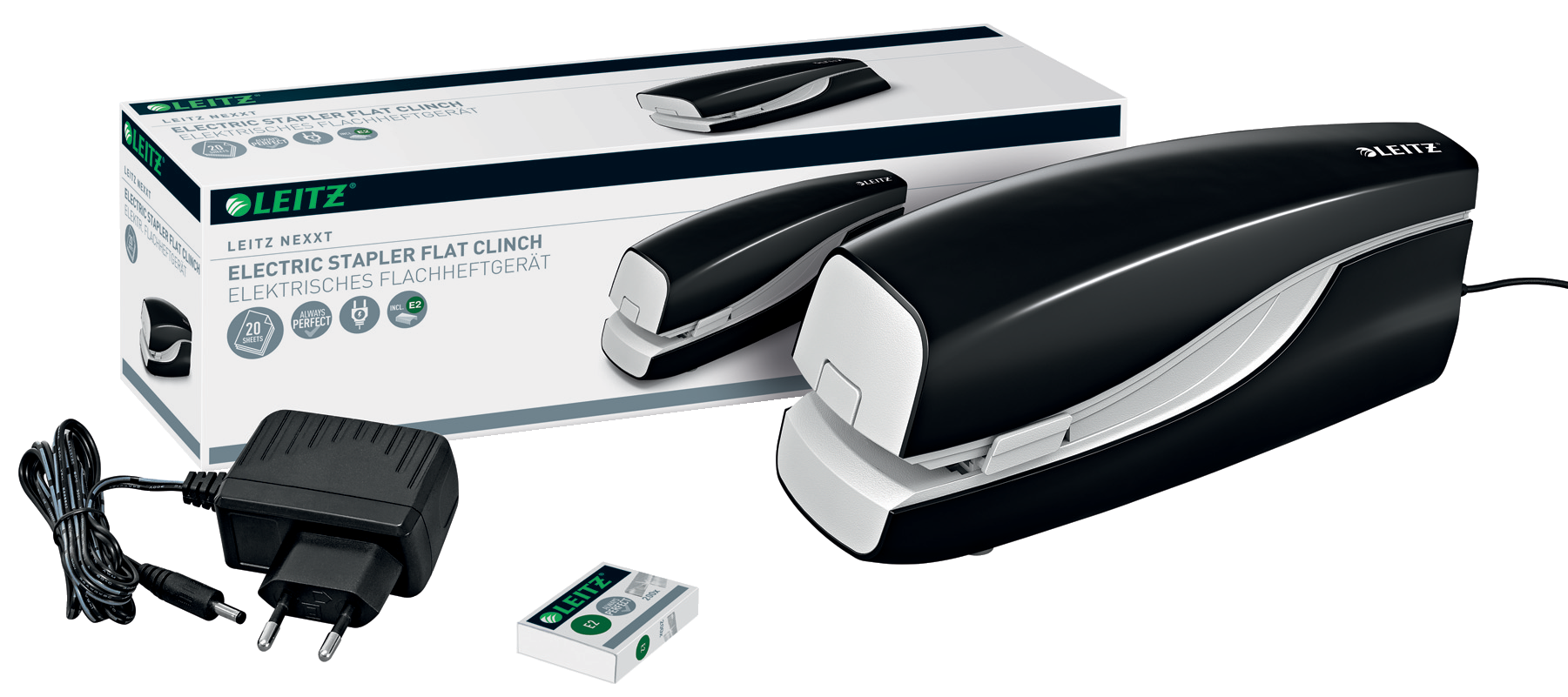 Hurtig og let hæftning. Ideel til frekvent brug. Hygiejnisk hæftning, da man ikke behøver at røre ved hæftemaskinen for at bruge den. Høj ydelse. Flat Clinch teknologi sparer op tll 30% arkiveringsplads. Leitz Electric E2 hæfteklammer sikrer perfekt og problemfri hæftning hver gang. Digonal hæftning muligt.