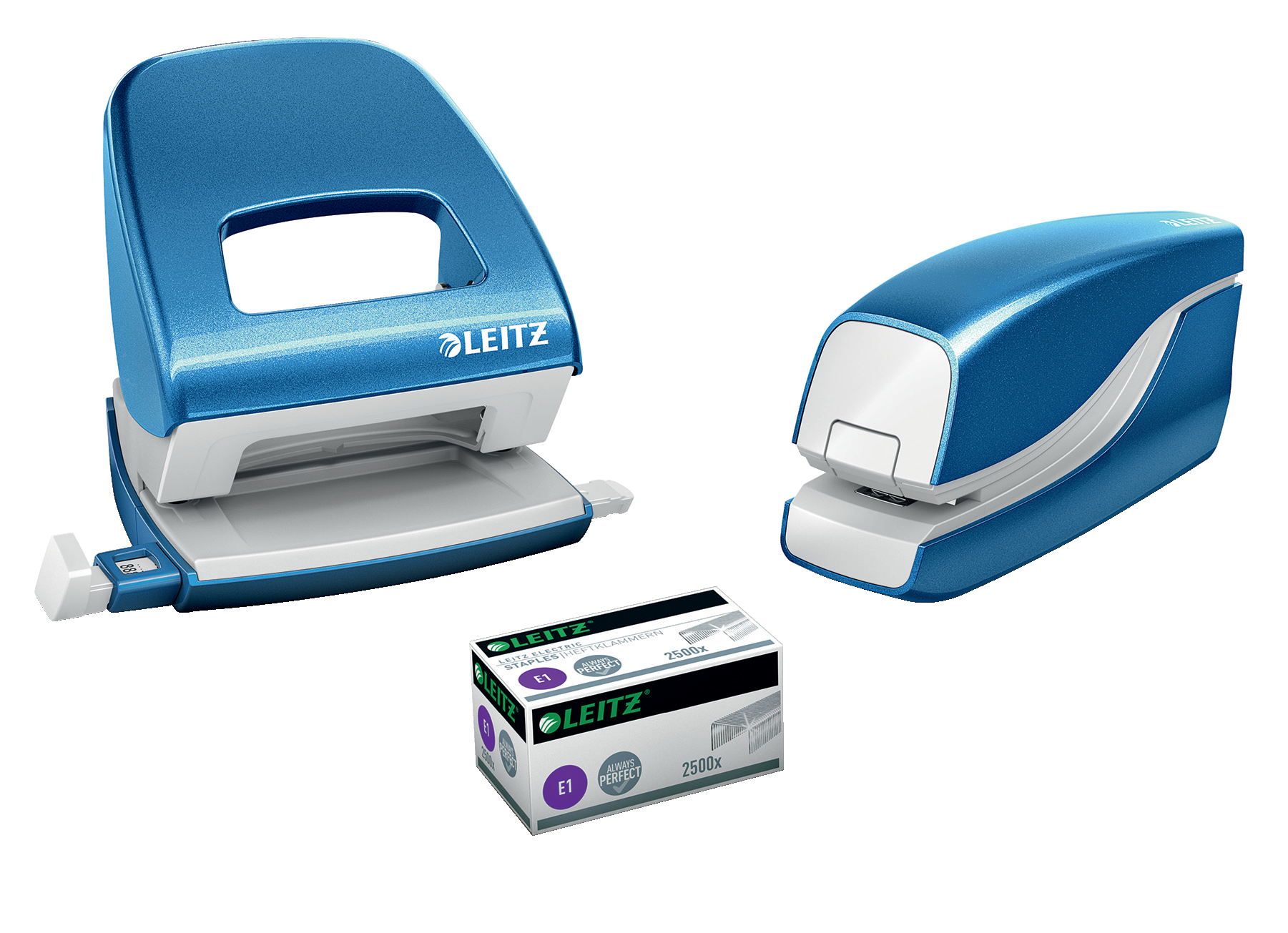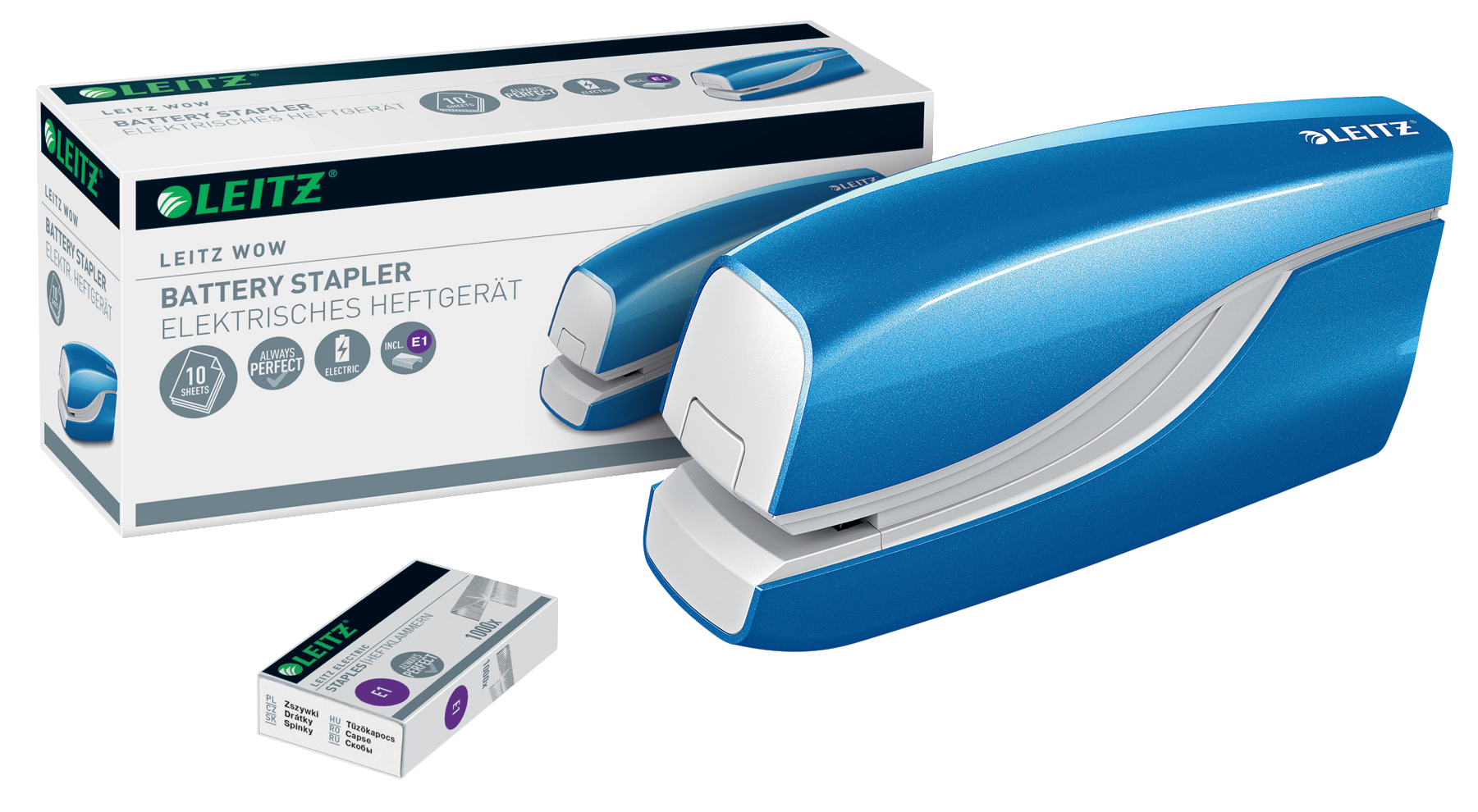 Ideel til frekvent brug. Hygiejnisk hæftning, da man ikke behøver at røre ved hæftemaskinen for at bruge den. I slående WOW farver, som lader din personlighed skinne igennem. Batteridrevet til bekvem brug på farten. Leitz e1 hæfteklammer sikrer perfekt hæftning hver gang.