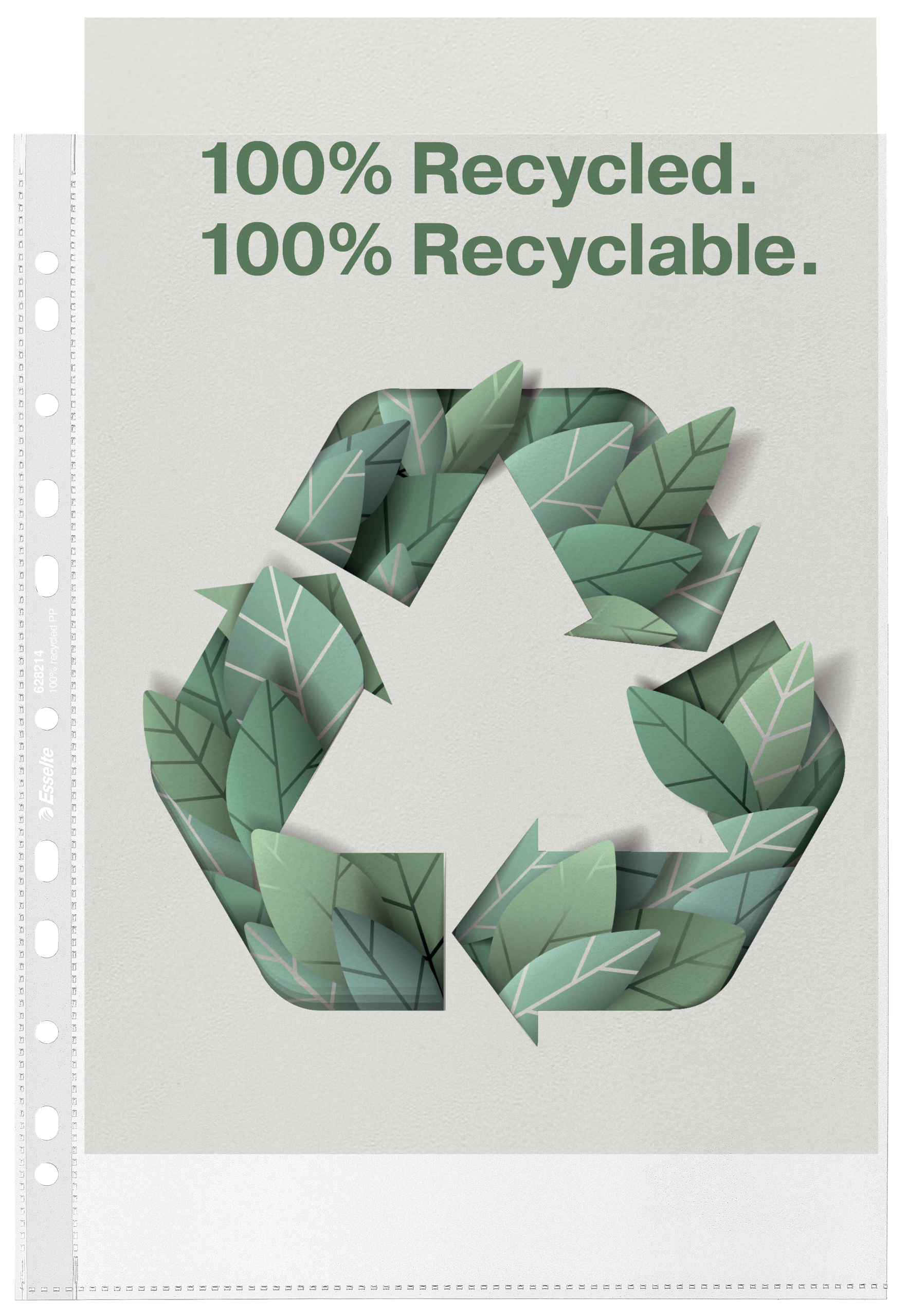 Fremstillet af 100% genbrugsplast (industriaffald/afskæringer eller produktionsrester: eksternt testet af UL) 100 % genanvendelig, emballage med genanvendt indhold. A4-lomme. Præget stærk PP 70 mic. Pose med 20 stk.