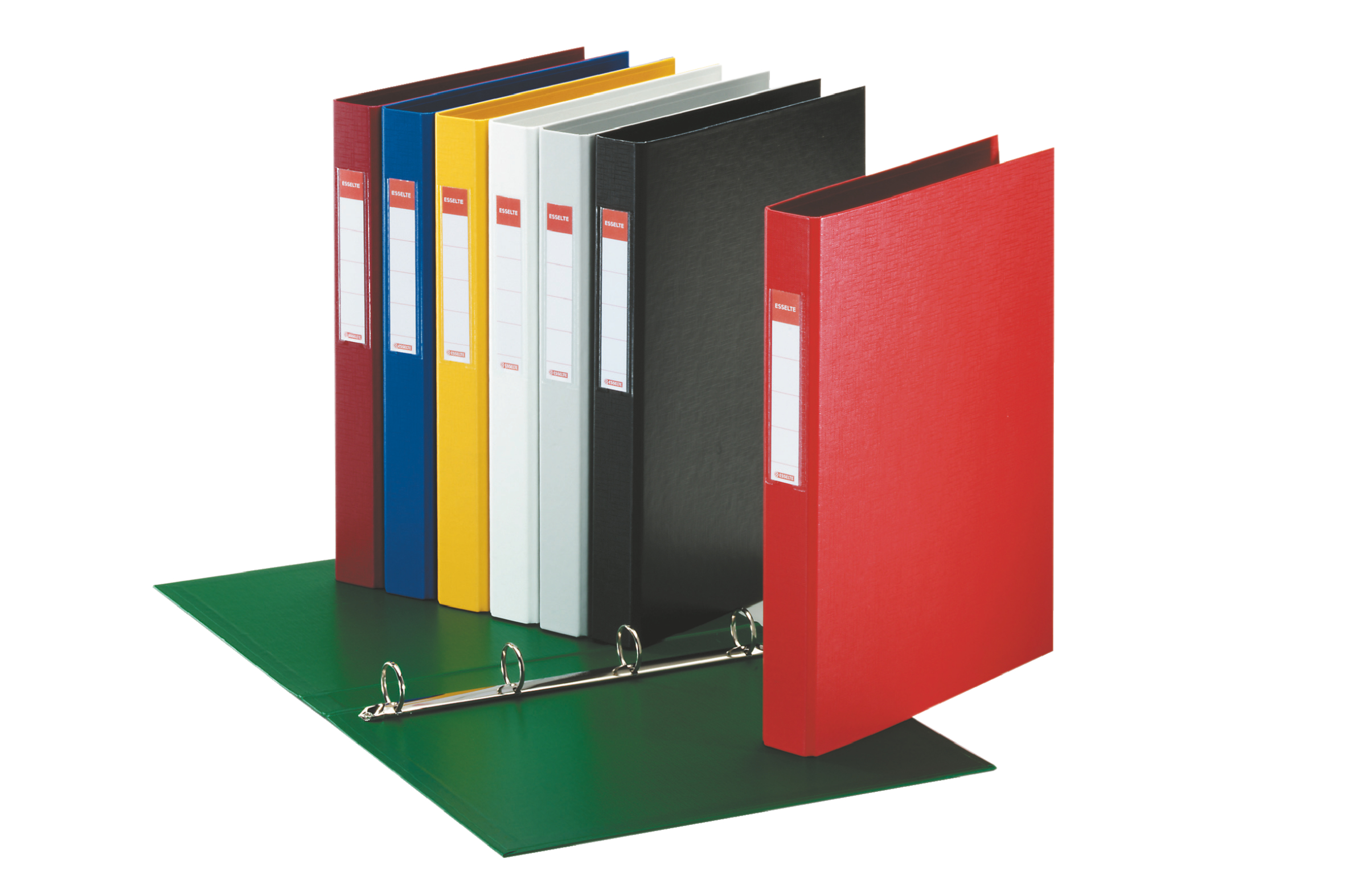 Ringordner i standard farver til kompakt opbevaring af hullede dokumenter.