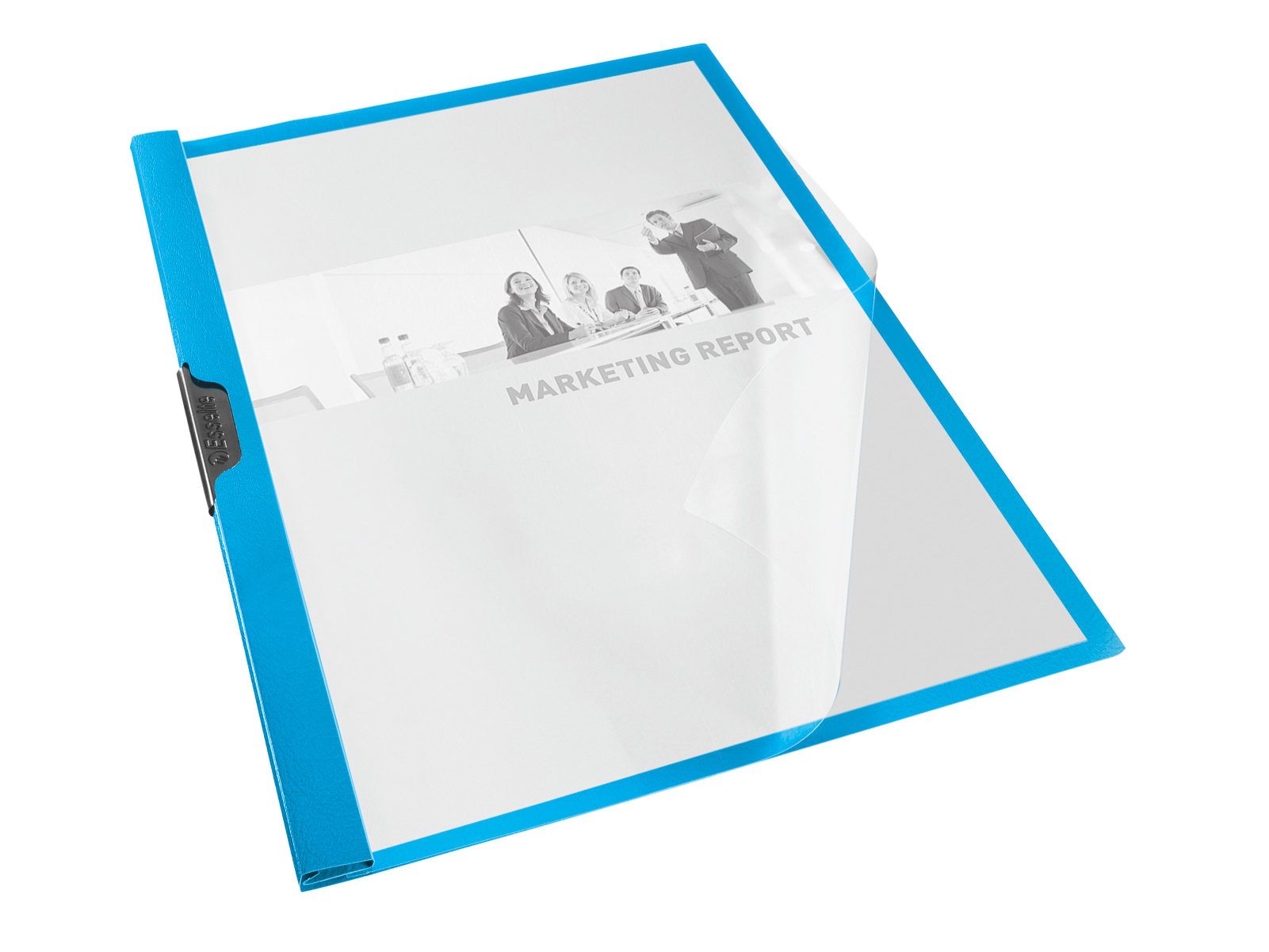 Robust præsentationsmappe med metalklemme i ryggen og transparent forside.