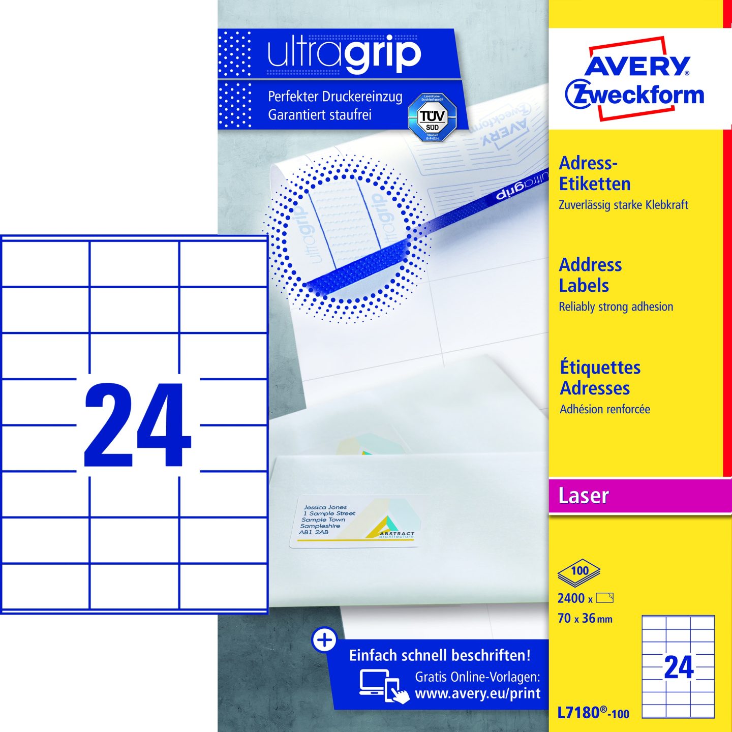 Etiketter med permanent lim. Velegnet som adresselabel. Pakken indeholder 100 ark med 24 etiketter.