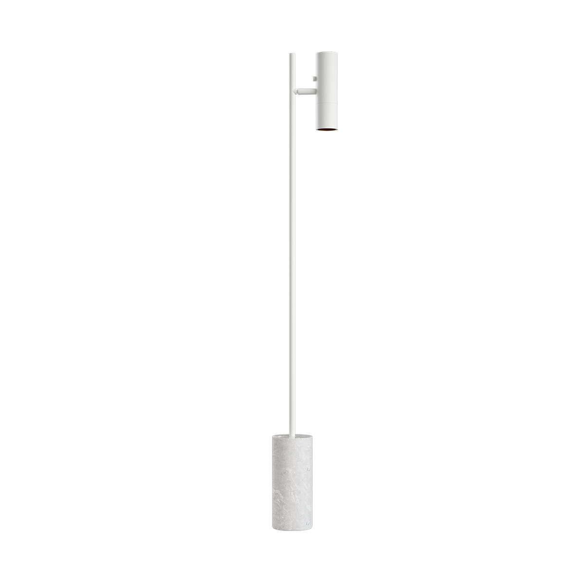 En gulvlampe, der illustrerer kompromisløst design, hvor både form og funktion smelter sammen i en perfekt enhed. Den kombinerer det kraftige aluminium med en mat overflade og en unik marmorfod for at skabe et enkelt og eksklusivt udtryk.