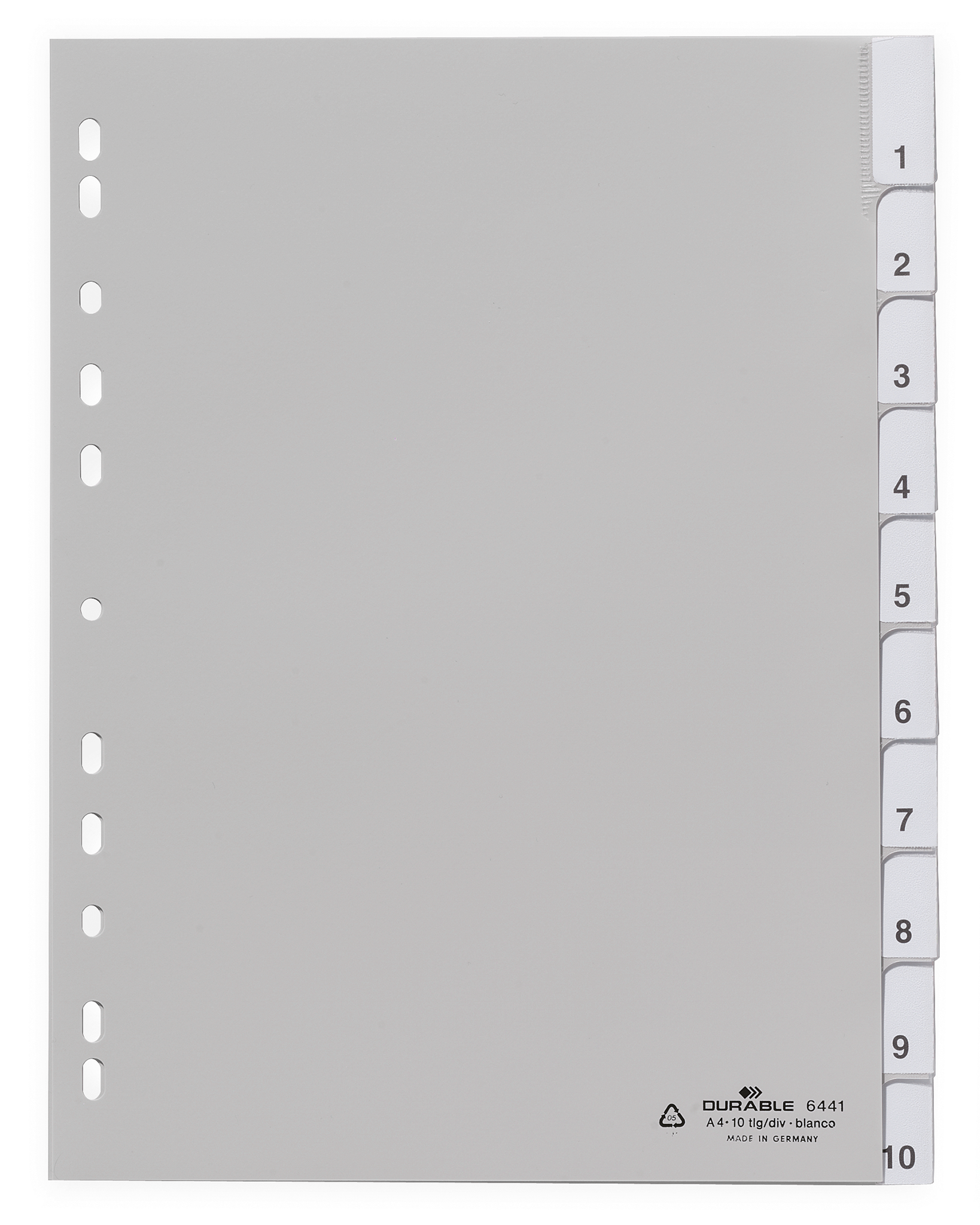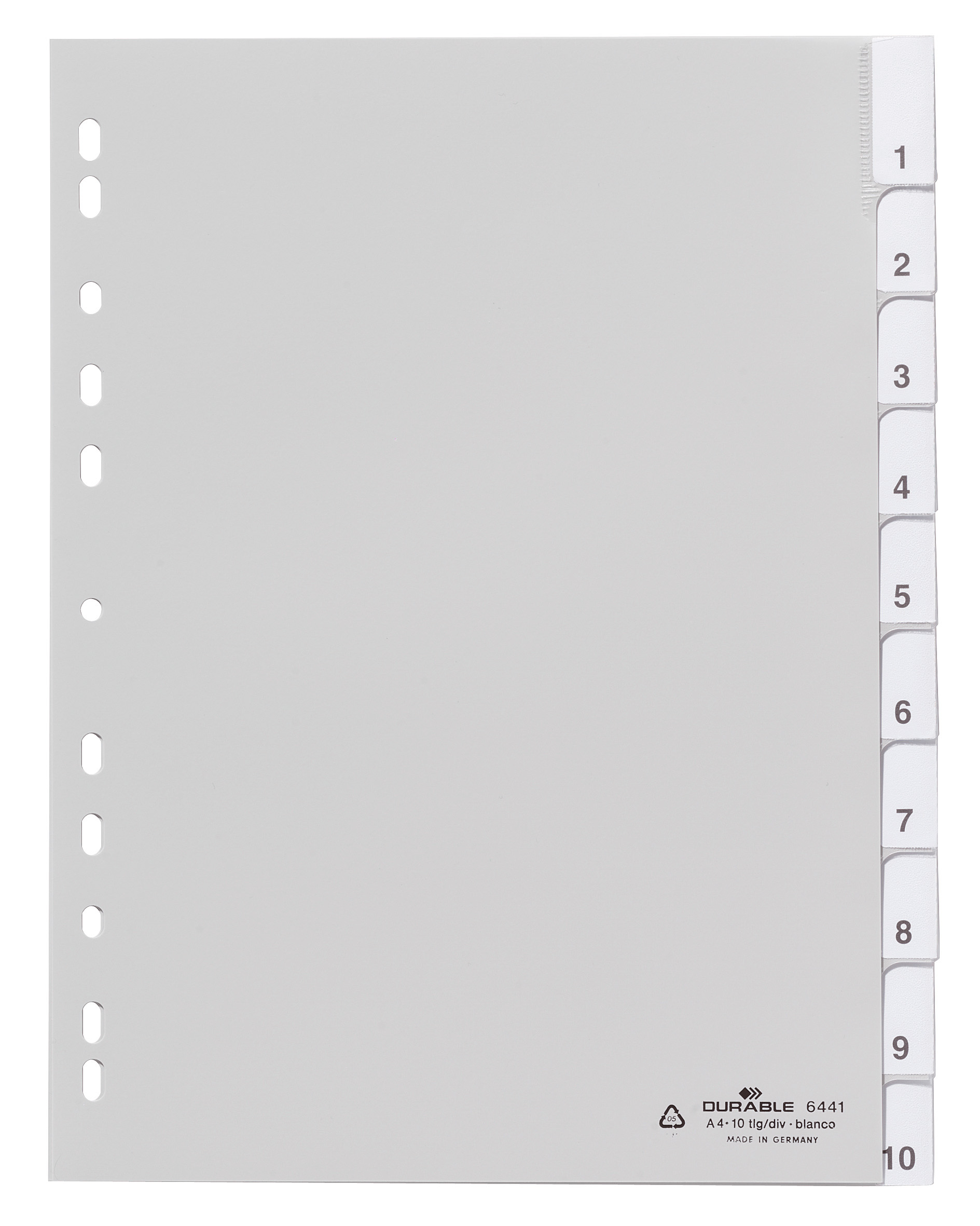 • Register med forstærkede faner og udskiftelige indstik • Med fortrykte indstik og blanke ekstra indstik • Blanke indstik til professionel udskrivning med DURAPRINT® • Printbart forsideblad (kun ved farvevarianten hvid) • Inddeling/blad: 1-10 • Universalhuller • Af PP • Til format: dækker helt A4-højformat • Mål: 297 x 215/230 mm