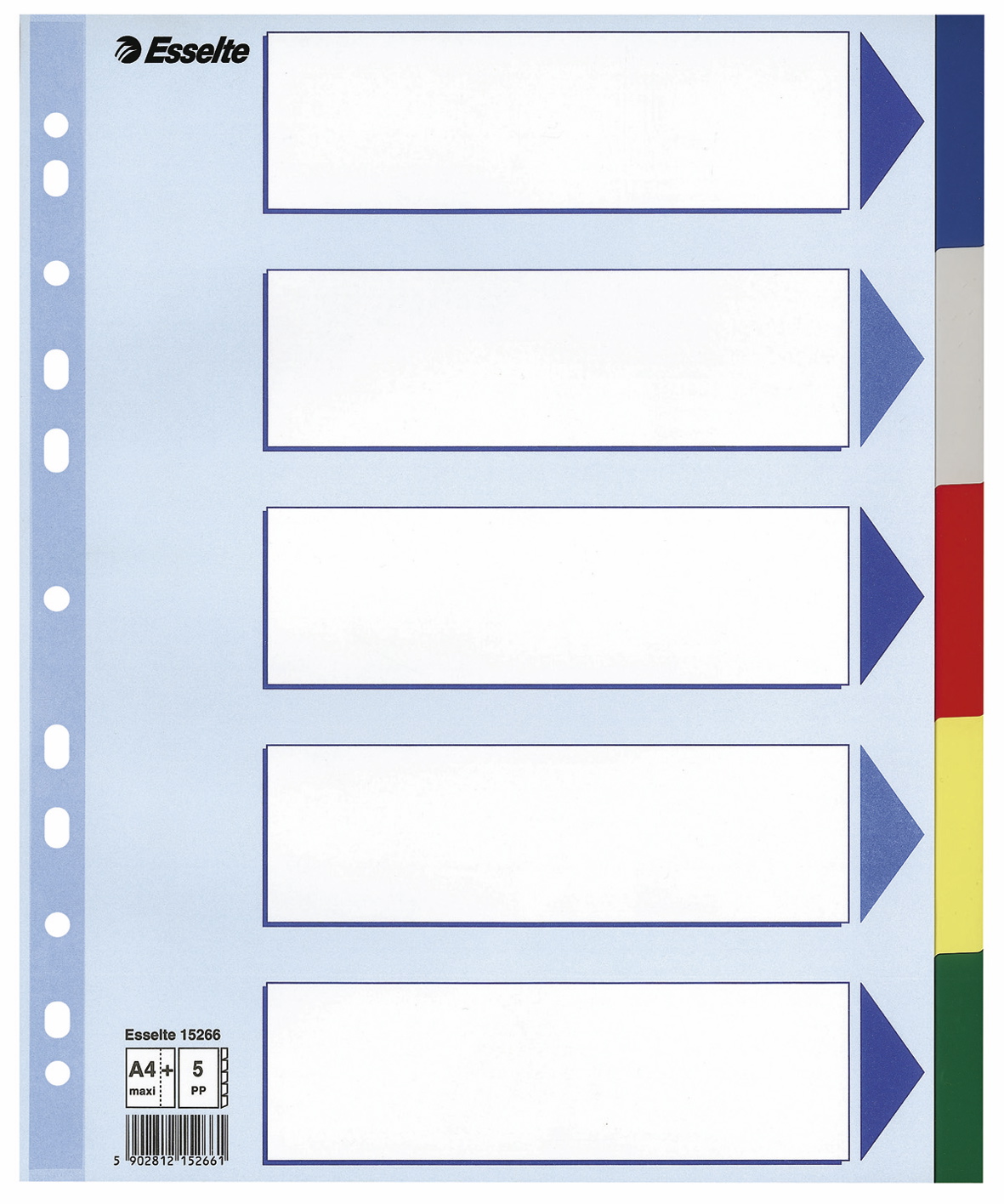 Faneblad fra Esselte i plastik og med forstærkede universalhuller. Fanebladet er 5-delt med pile og farver, hvilket giver dig et godt overblik. Da felterne ikke er nummererede, har du mulighed for selv at lave det system, du har brug for.