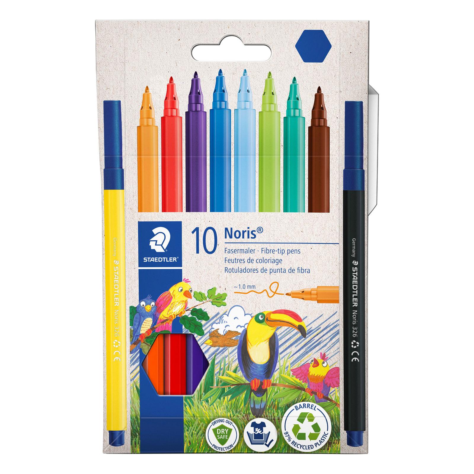 Noris® 326 tusser i høj kvalitet, produceret med 97% genanvendt plast. Perfekt til skolen og i børnehaven. Stabil, trykfast spids. Kan ligge uden hætte i dagevis uden udtørring . Vandbaseret. Ventileret hætte. Vaskes nemt ud af de fleste tekstiler. Pennehylster fremstillet af 97% genanvendt plast sikrer lang levetid. Stregbredde ca. 1.0 mm.