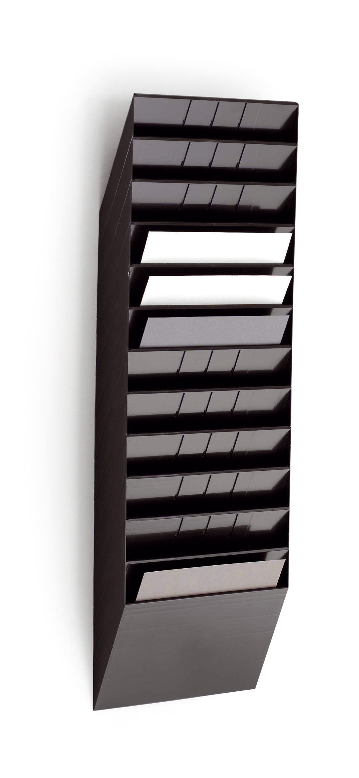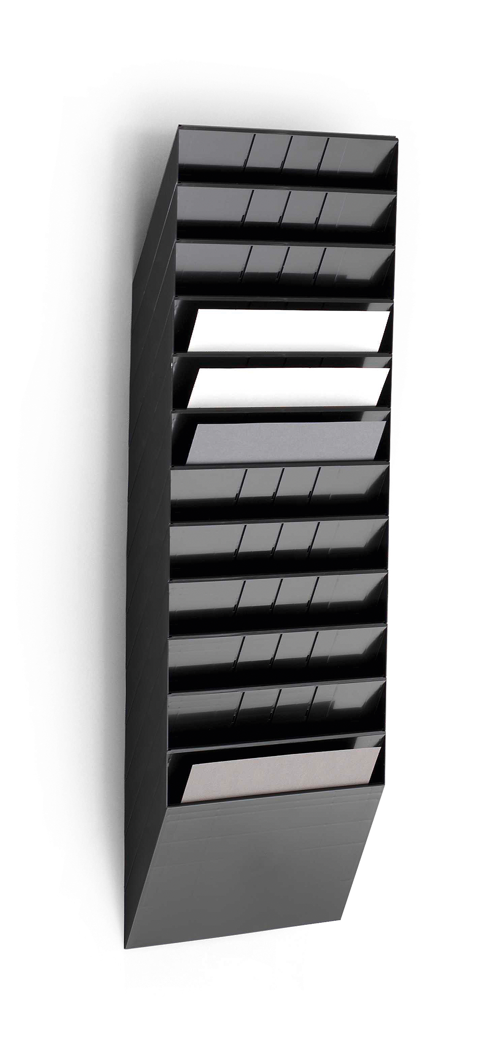 Brochurestativ med 12 bakker og en frontplade til opbevaring af brochurer og blanketter i A4 tværformat. Maksimal kapacitet 24mm tykke bundter. Vægmonteres eller placeres liggende på et bord. Mål: 348x1140x95 (BxHxD)s eller placeres liggende på et bord. Mål: 348x1140x95 (BxHxD)