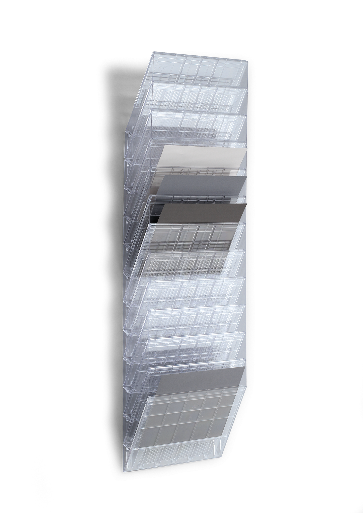 Brochurestativ med 12 bakker og en frontplade til opbevaring af brochurer og blanketter i A4 tværformat. Maksimal kapacitet 24mm tykke bundter. Vægmonteres eller placeres liggende på et bord. Mål: 348x1140x95 (BxHxD)s eller placeres liggende på et bord. Mål: 348x1140x95 (BxHxD)