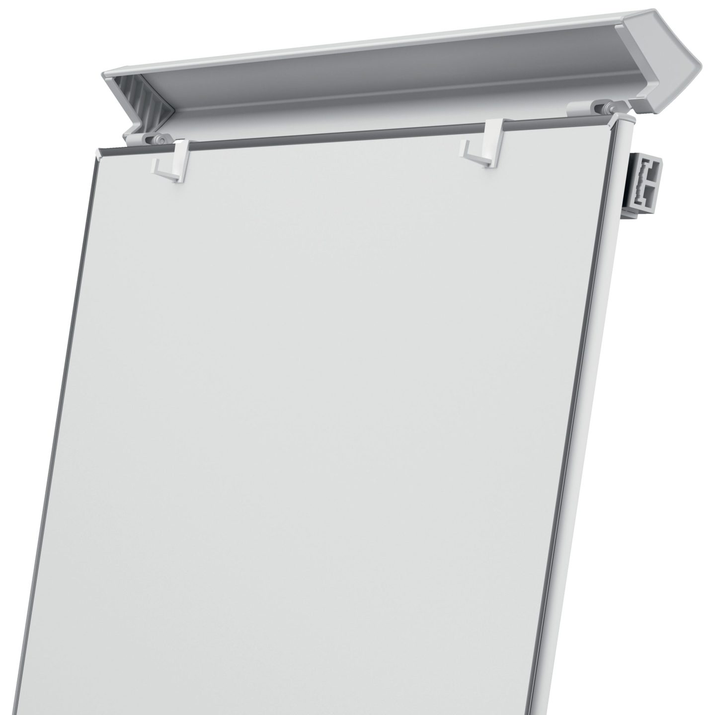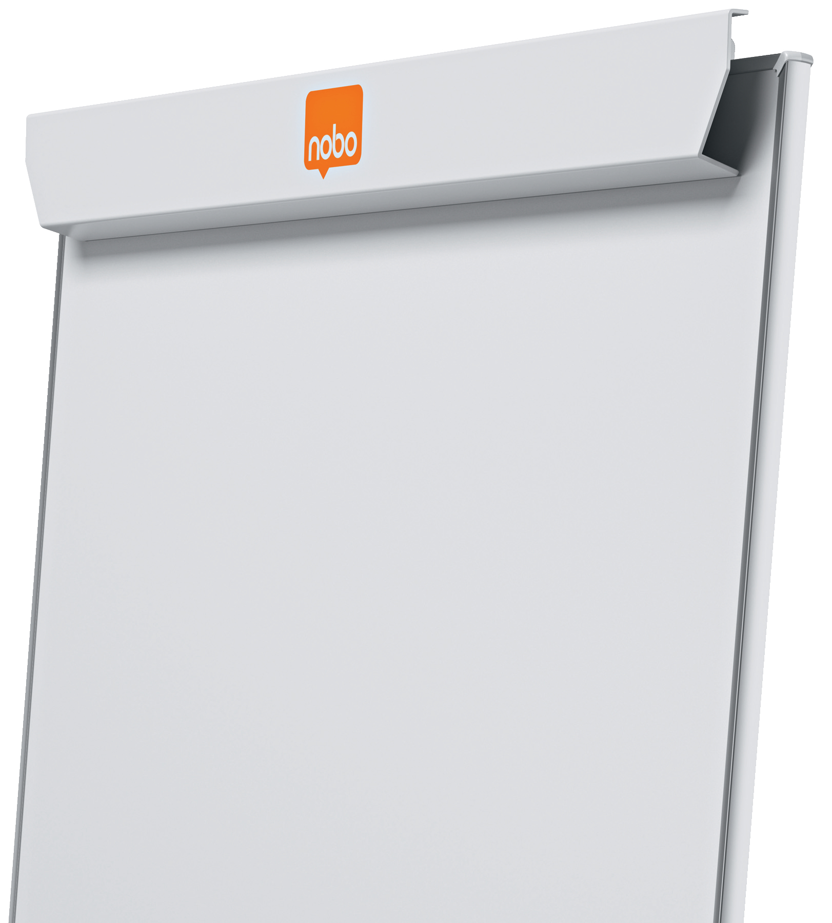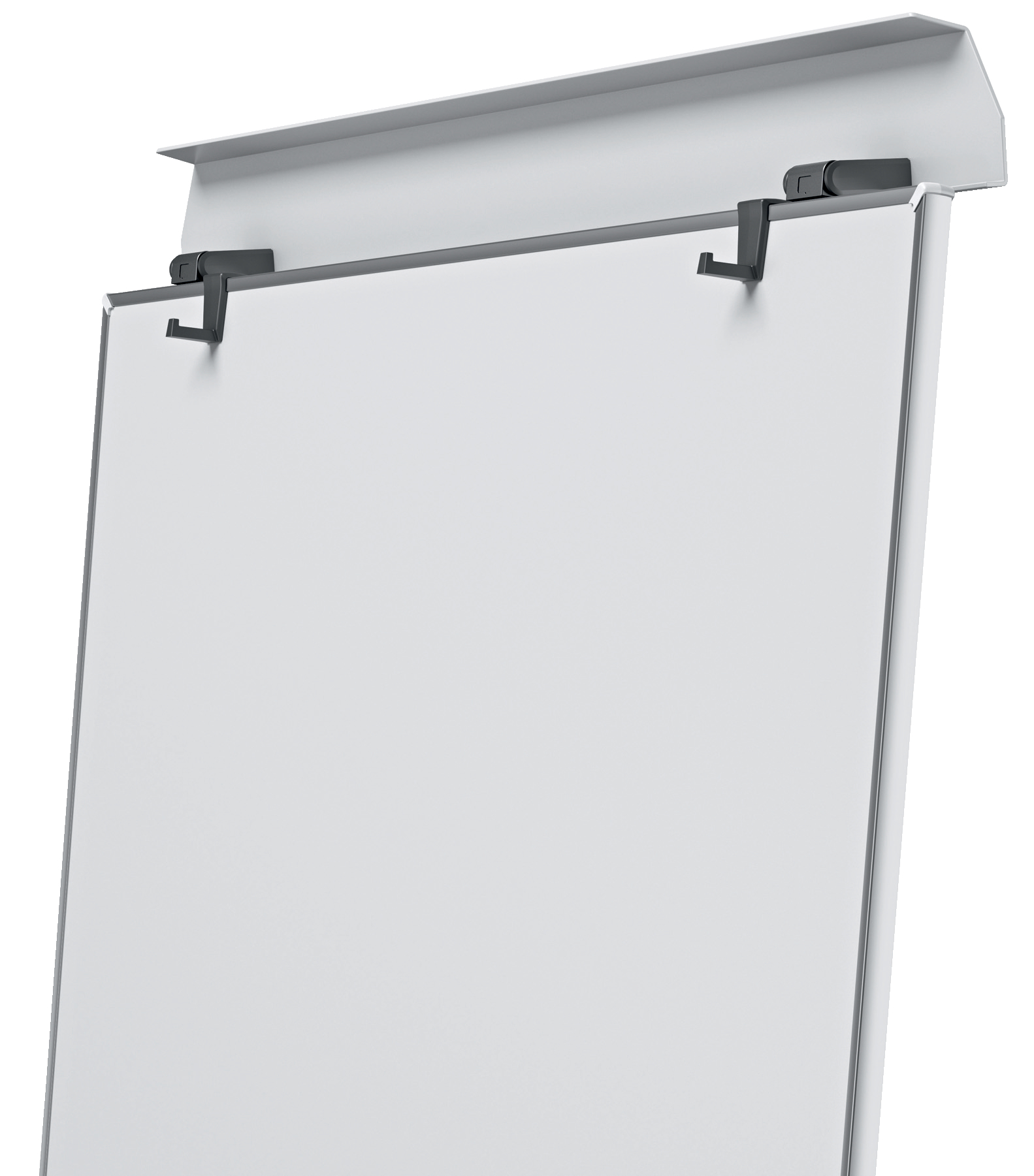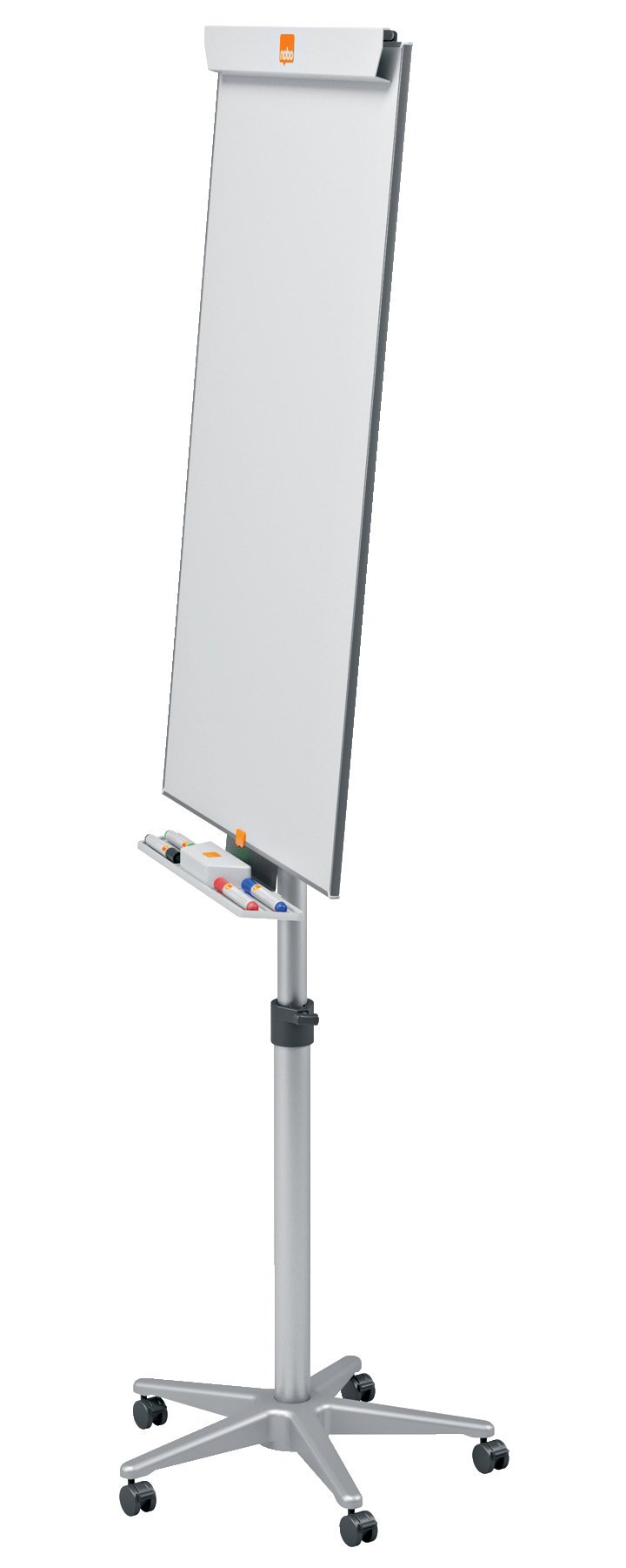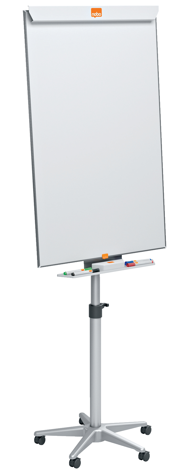 Skrivbar, drywipe overflade. Justerbar kroge, passer stort set til alle flipoverblokke. Pennebakke i metal i hele bredden. 5 hjul, 3 af disse kan låses. Let at justere i højden, har indbygget fjeder-s