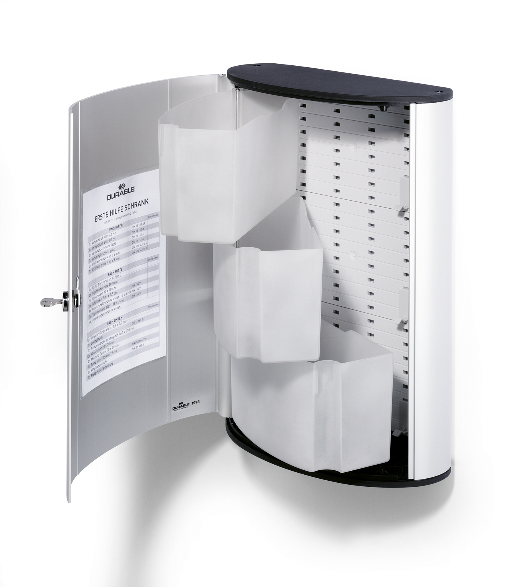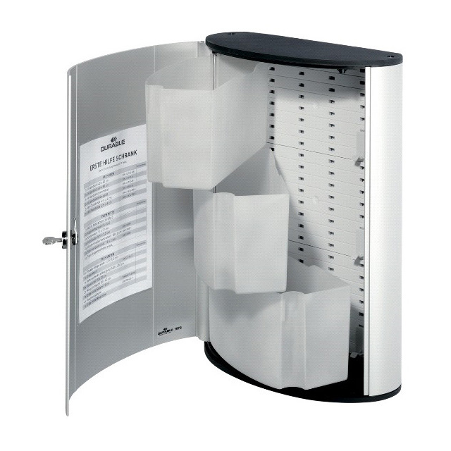 Praktisk førstehjælpsskab i flot design af børstet aluminium. Tre svingbare fag til opbevaring af førstehjælpsartikler. Skabet kan låses og der medfølger to nøgler. Førstehjælpssortiment (Durable art nr 197500) kan bestilles separat. Mål 400 x 302 x 118 mm. (HxBxD).