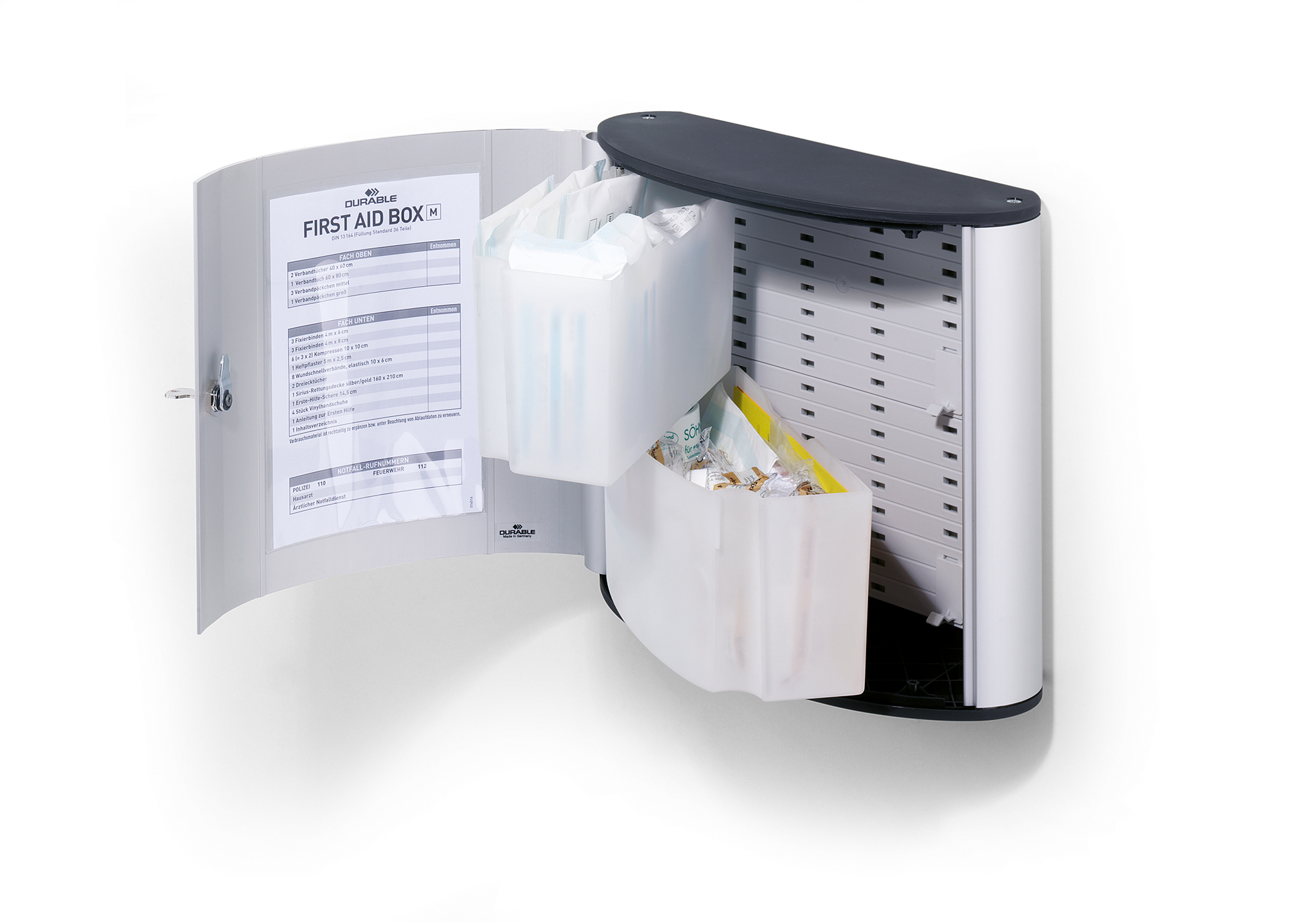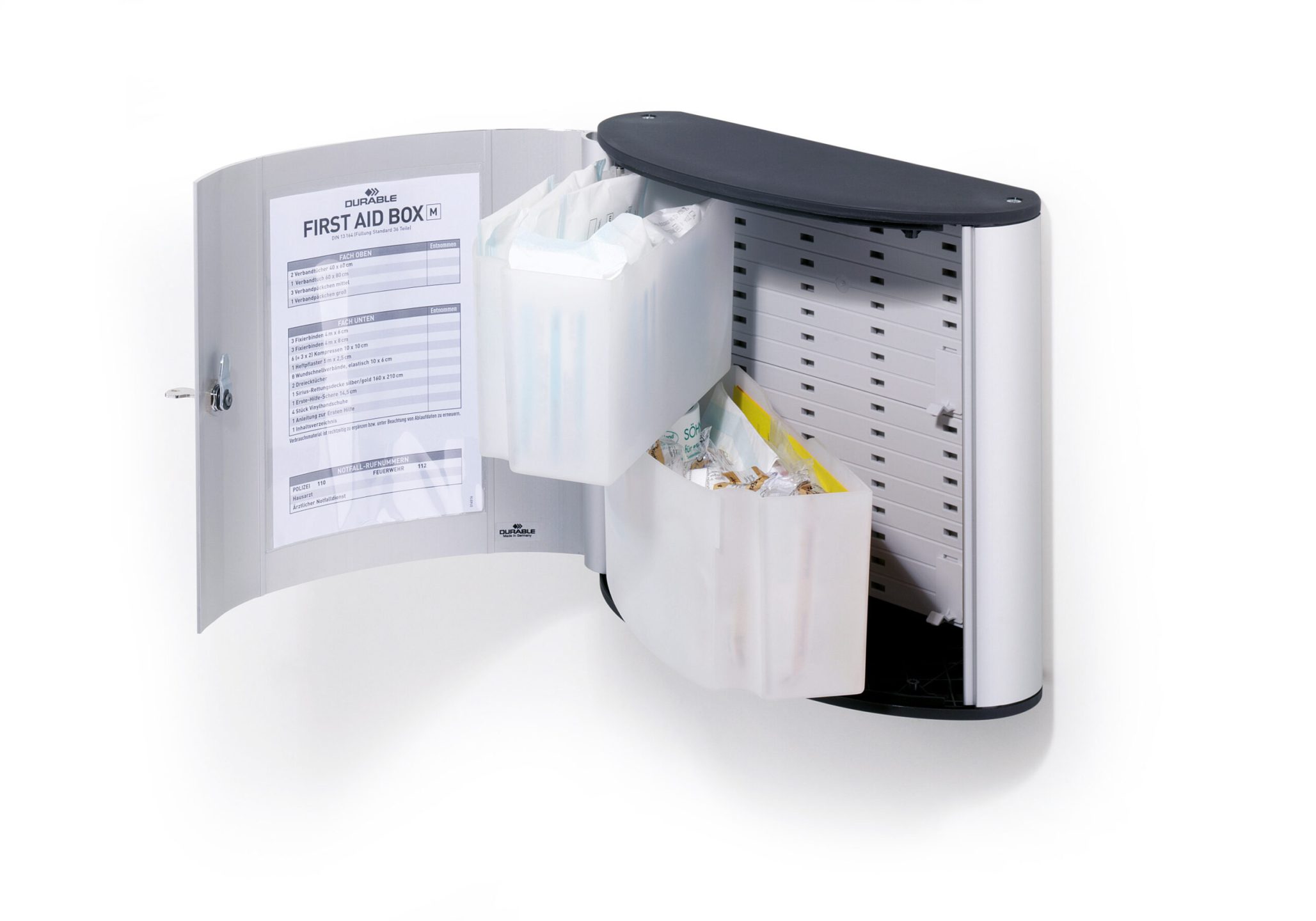 Førstehjælpsskab first aid set mFørstehjælpsskab med to fag med indhold (36 stk forskellige førstehjælpsartikler).