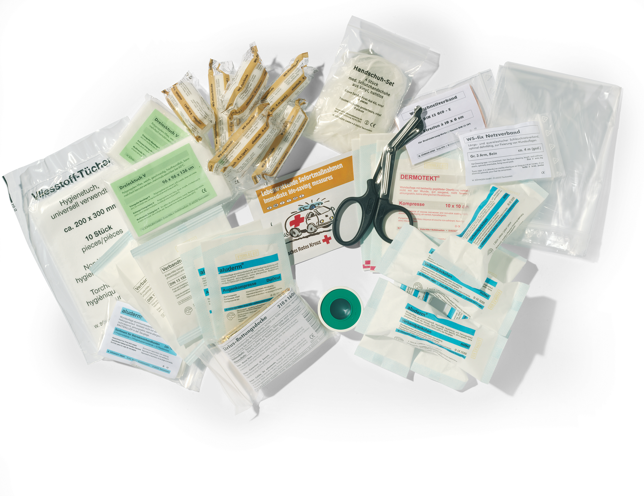 • Førstehjælpssortiment med 65 artikler iht. DIN 13157 (til administrations- og handelsvirksomheder med op til 50 medarbejdere, produktions- og forarbejdningsvirksomheder med op til 20 medarbejdere eller byggepladser med op til 10 medarbejdere) • Opfyldningssæt til førstehjælpsskab FIRST AID BOX L (artikelnr. 1973) og FIRST AID SET L (artikelnr. 1974)