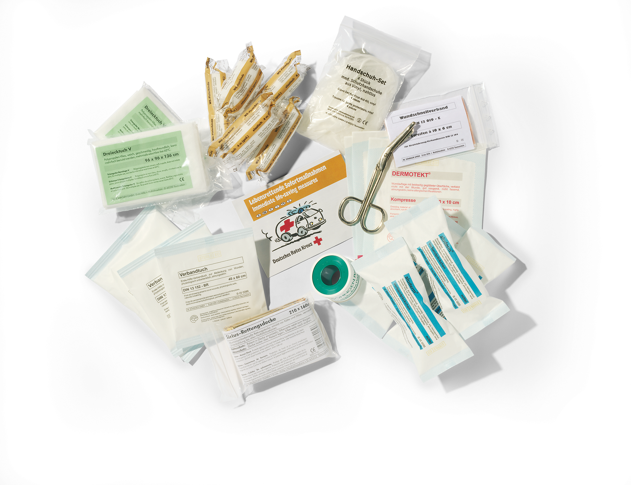 • Førstehjælpssortiment med 36 artikler iht. DIN 13164 (til privat anvendelse) • Opfyldningssæt til førstehjælpskasse FIRST AID BOX M (artikelnr. 1970) og FIRST AID SET M (artikelnr. 1971)