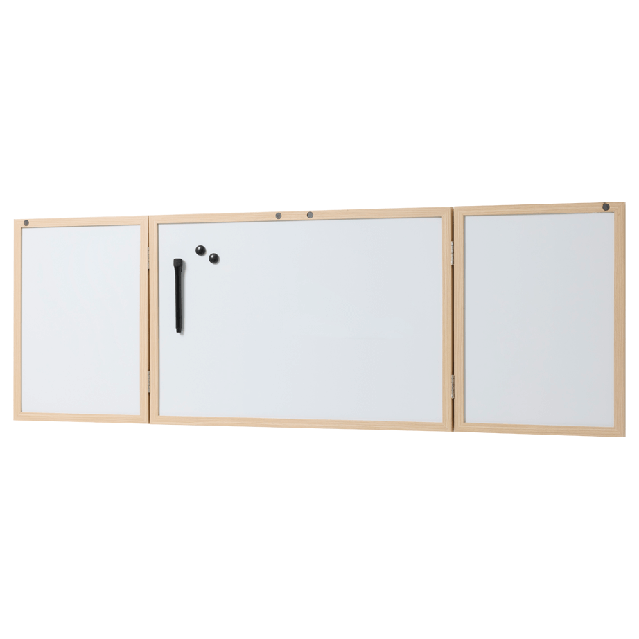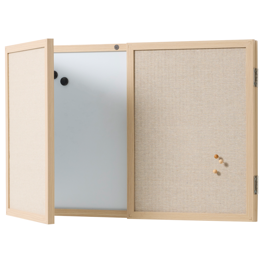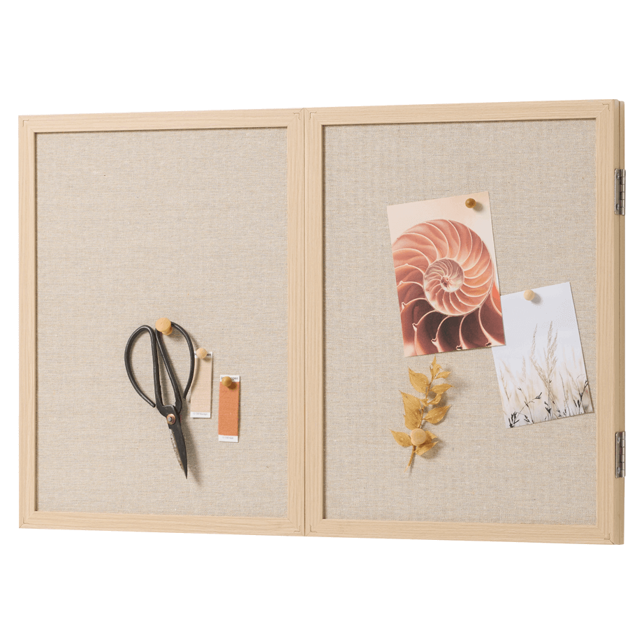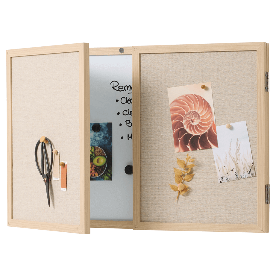 Whiteboard med låger og træramme 60 x 40 cm.Få styr på dine noter, idéer og hverdagens gøremål med dette elegante whiteboard med låger og ramme i egetræslook. En alt-i-en løsning, der gør planlægning og organisering både nemt og pænt.Bag de to låger gemmer der sig en magnetisk whiteboard-overflade. Skriv ugens planer med en whiteboard-marker, og visk tavlen ren igen med en tavlesvamp og eventuelt tavlerens. Ydersiden af lågerne fungerer som opslagstavler og er betrukket med et stof i flot, naturligt hørlook. Her kan du nemt fastgøre noter eller billeder med tegnestifter. Tilbehør købes separat.Når tavlen er lukket, har den et enkelt og stilrent udtryk. Små magneter i rammen holder lågerne sikkert på plads. Tavlen er en praktisk løsning til hjemmet, hvor du kan holde orden i hverdagen og stadig bevare et roligt udtryk på væggen.Rammen er fremstillet af MDF med en flot overflade i naturtro egetræslook.Tavlen måler 60 x 40 cm (udfoldet: 120 x 40 cm)